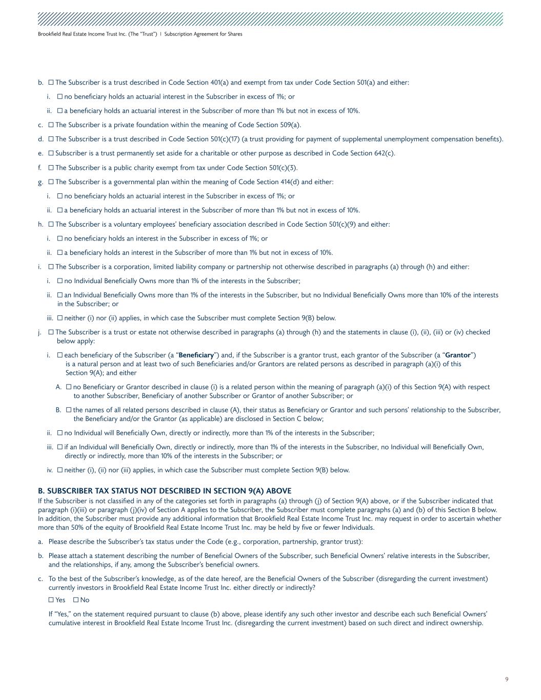 9 Brookfield Real Estate Income Trust Inc. (The “Trust”) I Subscription Agreement for Shares f. The Subscriber is a public charity exempt from tax under Code Section 501(c)(3). g. The Subscriber is a governmental plan within the meaning of Code Section 414(d) and either: i. no beneficiary holds an actuarial interest in the Subscriber in excess of 1%; or ii. a beneficiary holds an actuarial interest in the Subscriber of more than 1% but not in excess of 10%. h. The Subscriber is a voluntary employees’ beneficiary association described in Code Section 501(c)(9) and either: i. no beneficiary holds an interest in the Subscriber in excess of 1%; or ii. a beneficiary holds an interest in the Subscriber of more than 1% but not in excess of 10%. i. The Subscriber is a corporation, limited liability company or partnership not otherwise described in paragraphs (a) through (h) and either: i. no Individual Beneficially Owns more than 1% of the interests in the Subscriber; ii. an Individual Beneficially Owns more than 1% of the interests in the Subscriber, but no Individual Beneficially Owns more than 10% of the interests in the Subscriber; or iii. neither (i) nor (ii) applies, in which case the Subscriber must complete Section 9(B) below. j. The Subscriber is a trust or estate not otherwise described in paragraphs (a) through (h) and the statements in clause (i), (ii), (iii) or (iv) checked below apply: i. each beneficiary of the Subscriber (a “Beneficiary”) and, if the Subscriber is a grantor trust, each grantor of the Subscriber (a “Grantor”) is a natural person and at least two of such Beneficiaries and/or Grantors are related persons as described in paragraph (a)(i) of this Section 9(A); and either A. no Beneficiary or Grantor described in clause (i) is a related person within the meaning of paragraph (a)(i) of this Section 9(A) with respect to another Subscriber, Beneficiary of another Subscriber or Grantor of another Subscriber; or B. the names of all related persons described in clause (A), their status as Beneficiary or Grantor and such persons’ relationship to the Subscriber, the Beneficiary and/or the Grantor (as applicable) are disclosed in Section C below; ii. no Individual will Beneficially Own, directly or indirectly, more than 1% of the interests in the Subscriber; iii. if an Individual will Beneficially Own, directly or indirectly, more than 1% of the interests in the Subscriber, no Individual will Beneficially Own, directly or indirectly, more than 10% of the interests in the Subscriber; or iv. neither (i), (ii) nor (iii) applies, in which case the Subscriber must complete Section 9(B) below. B. SUBSCRIBER TAX STATUS NOT DESCRIBED IN SECTION 9(A) ABOVE If the Subscriber is not classified in any of the categories set forth in paragraphs (a) through (j) of Section 9(A) above, or if the Subscriber indicated that paragraph (i)(iii) or paragraph (j)(iv) of Section A applies to the Subscriber, the Subscriber must complete paragraphs (a) and (b) of this Section B below. In addition, the Subscriber must provide any additional information that Brookfield Real Estate Income Trust Inc. may request in order to ascertain whether more than 50% of the equity of Brookfield Real Estate Income Trust Inc. may be held by five or fewer Individuals. a. Please describe the Subscriber’s tax status under the Code (e.g., corporation, partnership, grantor trust): b. Please attach a statement describing the number of Beneficial Owners of the Subscriber, such Beneficial Owners’ relative interests in the Subscriber, and the relationships, if any, among the Subscriber’s beneficial owners. c. To the best of the Subscriber’s knowledge, as of the date hereof, are the Beneficial Owners of the Subscriber (disregarding the current investment) currently investors in Brookfield Real Estate Income Trust Inc. either directly or indirectly? Yes No If “Yes,” on the statement required pursuant to clause (b) above, please identify any such other investor and describe each such Beneficial Owners’ cumulative interest in Brookfield Real Estate Income Trust Inc. (disregarding the current investment) based on such direct and indirect ownership. b. The Subscriber is a trust described in Code Section 401(a) and exempt from tax under Code Section 501(a) and either: i. no beneficiary holds an actuarial interest in the Subscriber in excess of 1%; or ii. a beneficiary holds an actuarial interest in the Subscriber of more than 1% but not in excess of 10%. c. The Subscriber is a private foundation within the meaning of Code Section 509(a). d. The Subscriber is a trust described in Code Section 501(c)(17) (a trust providing for payment of supplemental unemployment compensation benefits). e. Subscriber is a trust permanently set aside for a charitable or other purpose as described in Code Section 642(c).