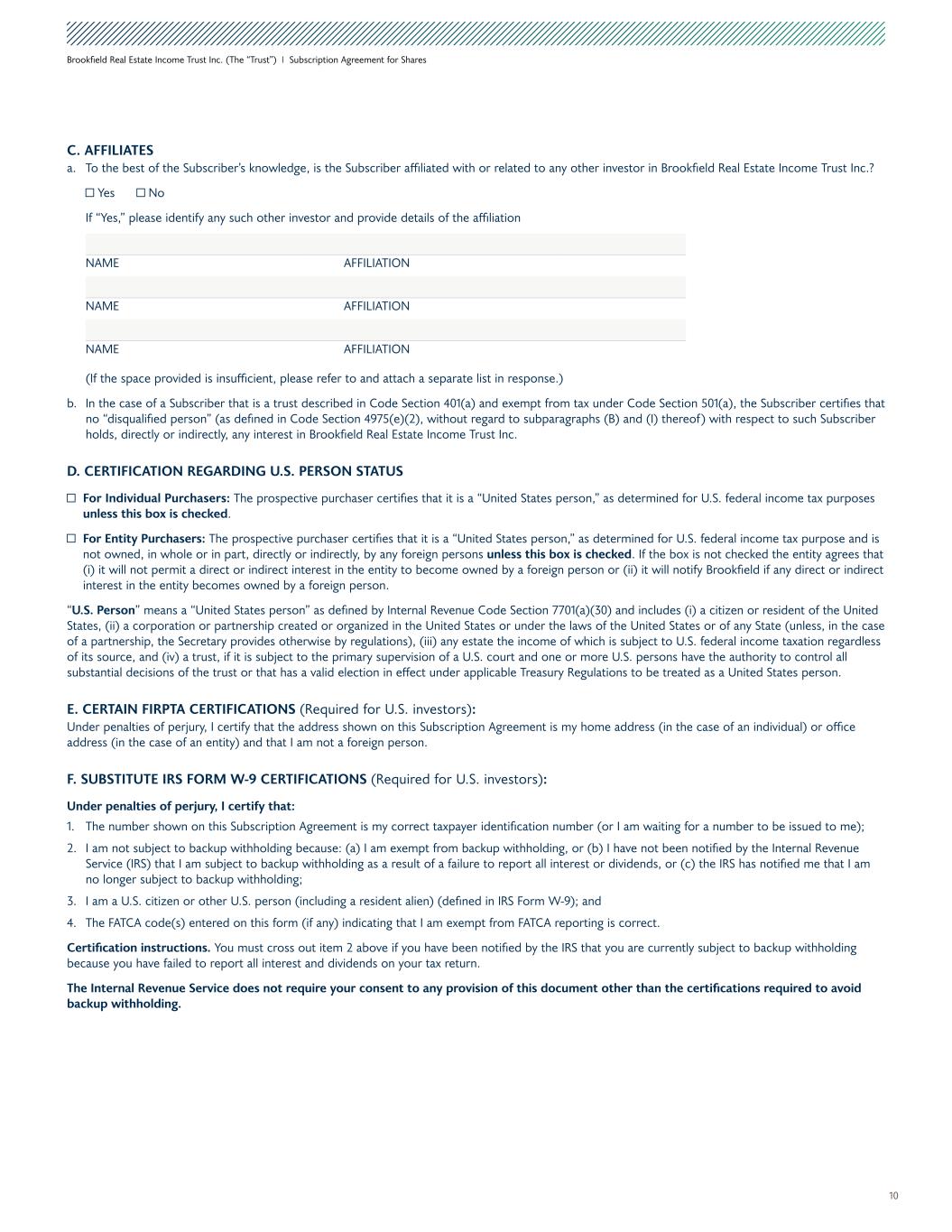 10 Brookfield Real Estate Income Trust Inc. (The “Trust”) I Subscription Agreement for Shares C. AFFILIATES a. To the best of the Subscriber’s knowledge, is the Subscriber affiliated with or related to any other investor in Brookfield Real Estate Income Trust Inc.? Yes No If “Yes,” please identify any such other investor and provide details of the affiliation (If the space provided is insufficient, please refer to and attach a separate list in response.) b. In the case of a Subscriber that is a trust described in Code Section 401(a) and exempt from tax under Code Section 501(a), the Subscriber certifies that no “disqualified person” (as defined in Code Section 4975(e)(2), without regard to subparagraphs (B) and (I) thereof) with respect to such Subscriber holds, directly or indirectly, any interest in Brookfield Real Estate Income Trust Inc. D. CERTIFICATION REGARDING U.S. PERSON STATUS For Individual Purchasers: The prospective purchaser certifies that it is a “United States person,” as determined for U.S. federal income tax purposes unless this box is checked. For Entity Purchasers: The prospective purchaser certifies that it is a “United States person,” as determined for U.S. federal income tax purpose and is not owned, in whole or in part, directly or indirectly, by any foreign persons unless this box is checked. If the box is not checked the entity agrees that (i) it will not permit a direct or indirect interest in the entity to become owned by a foreign person or (ii) it will notify Brookfield if any direct or indirect interest in the entity becomes owned by a foreign person. “U.S. Person” means a “United States person” as defined by Internal Revenue Code Section 7701(a)(30) and includes (i) a citizen or resident of the United States, (ii) a corporation or partnership created or organized in the United States or under the laws of the United States or of any State (unless, in the case of a partnership, the Secretary provides otherwise by regulations), (iii) any estate the income of which is subject to U.S. federal income taxation regardless of its source, and (iv) a trust, if it is subject to the primary supervision of a U.S. court and one or more U.S. persons have the authority to control all substantial decisions of the trust or that has a valid election in effect under applicable Treasury Regulations to be treated as a United States person. E. CERTAIN FIRPTA CERTIFICATIONS (Required for U.S. investors): Under penalties of perjury, I certify that the address shown on this Subscription Agreement is my home address (in the case of an individual) or office address (in the case of an entity) and that I am not a foreign person. F. SUBSTITUTE IRS FORM W-9 CERTIFICATIONS (Required for U.S. investors): Under penalties of perjury, I certify that: 1. The number shown on this Subscription Agreement is my correct taxpayer identification number (or I am waiting for a number to be issued to me); 2. I am not subject to backup withholding because: (a) I am exempt from backup withholding, or (b) I have not been notified by the Internal Revenue Service (IRS) that I am subject to backup withholding as a result of a failure to report all interest or dividends, or (c) the IRS has notified me that I am no longer subject to backup withholding; 3. I am a U.S. citizen or other U.S. person (including a resident alien) (defined in IRS Form W-9); and 4. The FATCA code(s) entered on this form (if any) indicating that I am exempt from FATCA reporting is correct. Certification instructions. You must cross out item 2 above if you have been notified by the IRS that you are currently subject to backup withholding because you have failed to report all interest and dividends on your tax return. The Internal Revenue Service does not require your consent to any provision of this document other than the certifications required to avoid backup withholding. NAME AFFILIATION NAME AFFILIATION NAME AFFILIATION