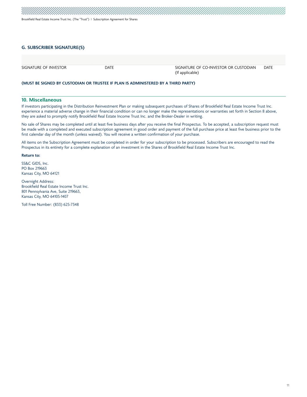 11 Brookfield Real Estate Income Trust Inc. (The “Trust”) I Subscription Agreement for Shares G. SUBSCRIBER SIGNATURE(S) SIGNATURE OF INVESTOR DATE SIGNATURE OF CO-INVESTOR OR CUSTODIAN (If applicable) DATE (MUST BE SIGNED BY CUSTODIAN OR TRUSTEE IF PLAN IS ADMINISTERED BY A THIRD PARTY) 10. Miscellaneous If investors participating in the Distribution Reinvestment Plan or making subsequent purchases of Shares of Brookfield Real Estate Income Trust Inc. experience a material adverse change in their financial condition or can no longer make the representations or warranties set forth in Section 8 above, they are asked to promptly notify Brookfield Real Estate Income Trust Inc. and the Broker-Dealer in writing. No sale of Shares may be completed until at least five business days after you receive the final Prospectus. To be accepted, a subscription request must be made with a completed and executed subscription agreement in good order and payment of the full purchase price at least five business prior to the first calendar day of the month (unless waived). You will receive a written confirmation of your purchase. All items on the Subscription Agreement must be completed in order for your subscription to be processed. Subscribers are encouraged to read the Prospectus in its entirety for a complete explanation of an investment in the Shares of Brookfield Real Estate Income Trust Inc. Return to: SS&C GIDS, Inc. PO Box 219663 Kansas City, MO 64121 Overnight Address: Brookfield Real Estate Income Trust Inc. 801 Pennsylvania Ave, Suite 219663, Kansas City, MO 64105-1407 Toll Free Number: (833) 625-7348