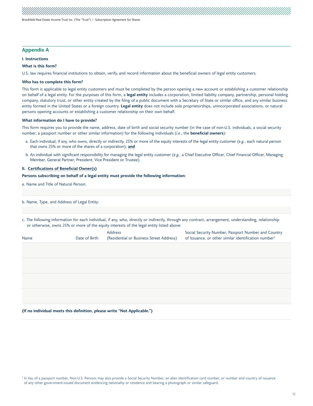 12 Brookfield Real Estate Income Trust Inc. (The “Trust”) I Subscription Agreement for Shares Appendix A I. Instructions What is this form? U.S. law requires financial institutions to obtain, verify, and record information about the beneficial owners of legal entity customers. Who has to complete this form? This form is applicable to legal entity customers and must be completed by the person opening a new account or establishing a customer relationship on behalf of a legal entity. For the purposes of this form, a legal entity includes a corporation, limited liability company, partnership, personal holding company, statutory trust, or other entity created by the filing of a public document with a Secretary of State or similar office, and any similar business entity formed in the United States or a foreign country. Legal entity does not include sole proprietorships, unincorporated associations, or natural persons opening accounts or establishing a customer relationship on their own behalf. What information do I have to provide? This form requires you to provide the name, address, date of birth and social security number (in the case of non-U.S. individuals, a social security number, a passport number or other similar information) for the following individuals (i.e., the beneficial owners): a. Each individual, if any, who owns, directly or indirectly, 25% or more of the equity interests of the legal entity customer (e.g., each natural person that owns 25% or more of the shares of a corporation); and b. An individual with significant responsibility for managing the legal entity customer (e.g., a Chief Executive Officer, Chief Financial Officer, Managing Member, General Partner, President, Vice President or Trustee). II. Certifications of Beneficial Owner(s) Persons subscribing on behalf of a legal entity must provide the following information: a. Name and Title of Natural Person: b. Name, Type, and Address of Legal Entity: c. The following information for each individual, if any, who, directly or indirectly, through any contract, arrangement, understanding, relationship or otherwise, owns 25% or more of the equity interests of the legal entity listed above: Name Date of Birth Address (Residential or Business Street Address) Social Security Number, Passport Number and Country of Issuance, or other similar identification number2 (If no individual meets this definition, please write “Not Applicable.”) 2 In lieu of a passport number, Non-U.S. Persons may also provide a Social Security Number, an alien identification card number, or number and country of issuance of any other government-issued document evidencing nationality or residence and bearing a photograph or similar safeguard.