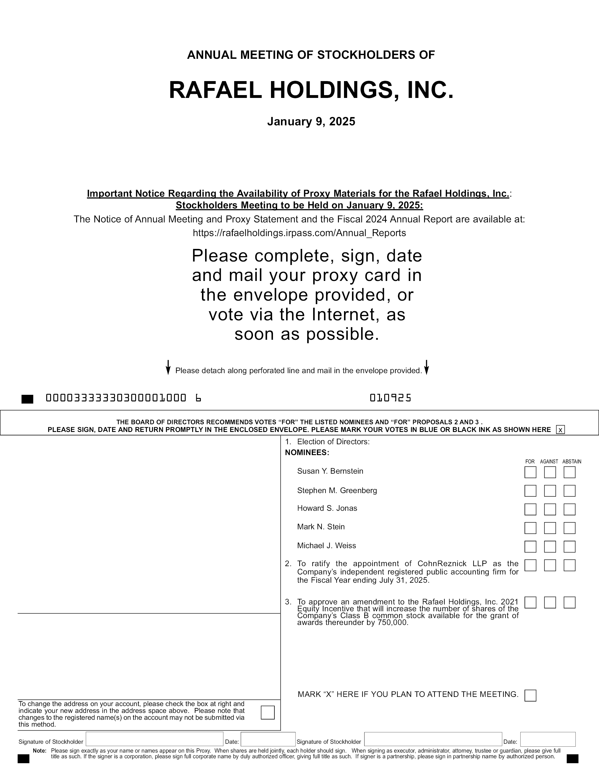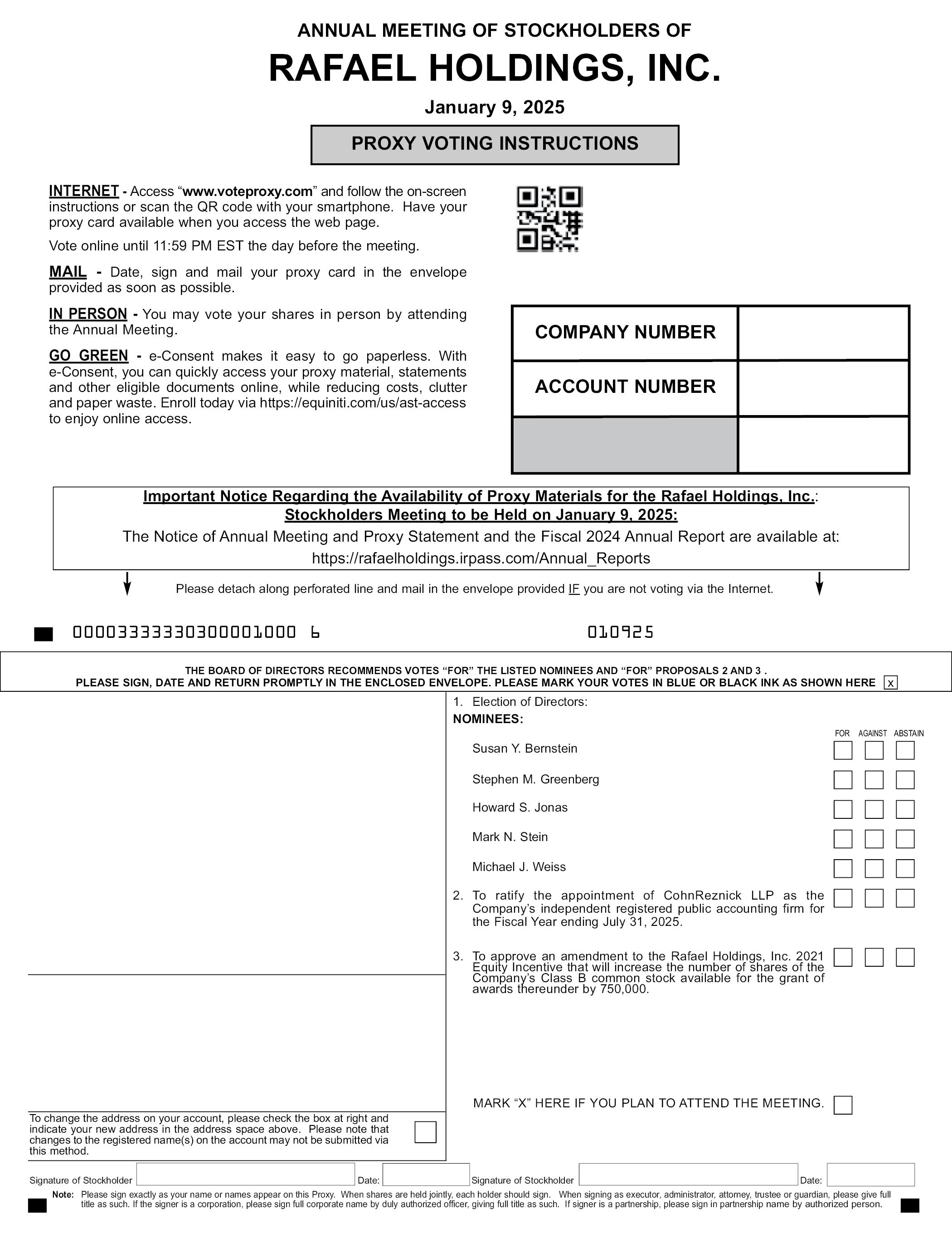 ANNUAL MEETING OF STOCKHOLDERS OF RAFAEL HOLDINGS, INC. January 9, 2025 Important Notice Regarding the Availability of Proxy Materials for the Rafael Holdings, Inc.: Stockholders Meeting to be Held on January 9, 2025: The Notice of Annual Meeting and Proxy Statement and the Fiscal 2024 Annual Report are available at: https://rafaelholdings.irpass.com/Annual_Reports Please complete, sign, date and mail your proxy card in the envelope provided, or vote via the Internet, as soon as possible. Please detach along perforated line and mail in the envelope provided. 00003333330300001000 6 010925 THE BOARD OF DIRECTORS RECOMMENDS VOTES “FOR” THE LISTED NOMINEES AND “FOR” PROPOSALS 2 AND 3 . PLEASE SIGN, DATE AND RETURN PROMPTLY IN THE ENCLOSED ENVELOPE. PLEASE MARK YOUR VOTES IN BLUE OR BLACK INK AS SHOWN HERE 1. Election of Directors: NOMINEES: Susan Y. Bernstein Stephen M. Greenberg Howard S. Jonas Mark N. Stein Michael J. Weiss 2. To ratify the appointment of CohnReznick LLP as the Company’s independent registered public accounting firm for the Fiscal Year ending July 31, 2025. 3. To approve an amendment to the Rafael Holdings, Inc. 2021 Equity Incentive that will increase the number of shares of the Company’s Class B common stock available for the grant of awards thereunder by 750,000. FOR AGAINST ABSTAIN To change the address on your account, please check the box at right and indicate your new address in the address space above. Please note that changes to the registered name(s) on the account may not be submitted via this method. MARK “X” HERE IF YOU PLAN TO ATTEND THE MEETING. Signature of Stockholder Date: Signature of Stockholder Date: Note: Please sign exactly as your name or names appear on this Proxy. When shares are held jointly, each holder should sign. When signing as executor, administrator, attorney, trustee or guardian, please give full title as such. If the signer is a corporation, please sign full corporate name by duly authorized officer, giving full title as such. If signer is a partnership, please sign in partnership name by authorized person.