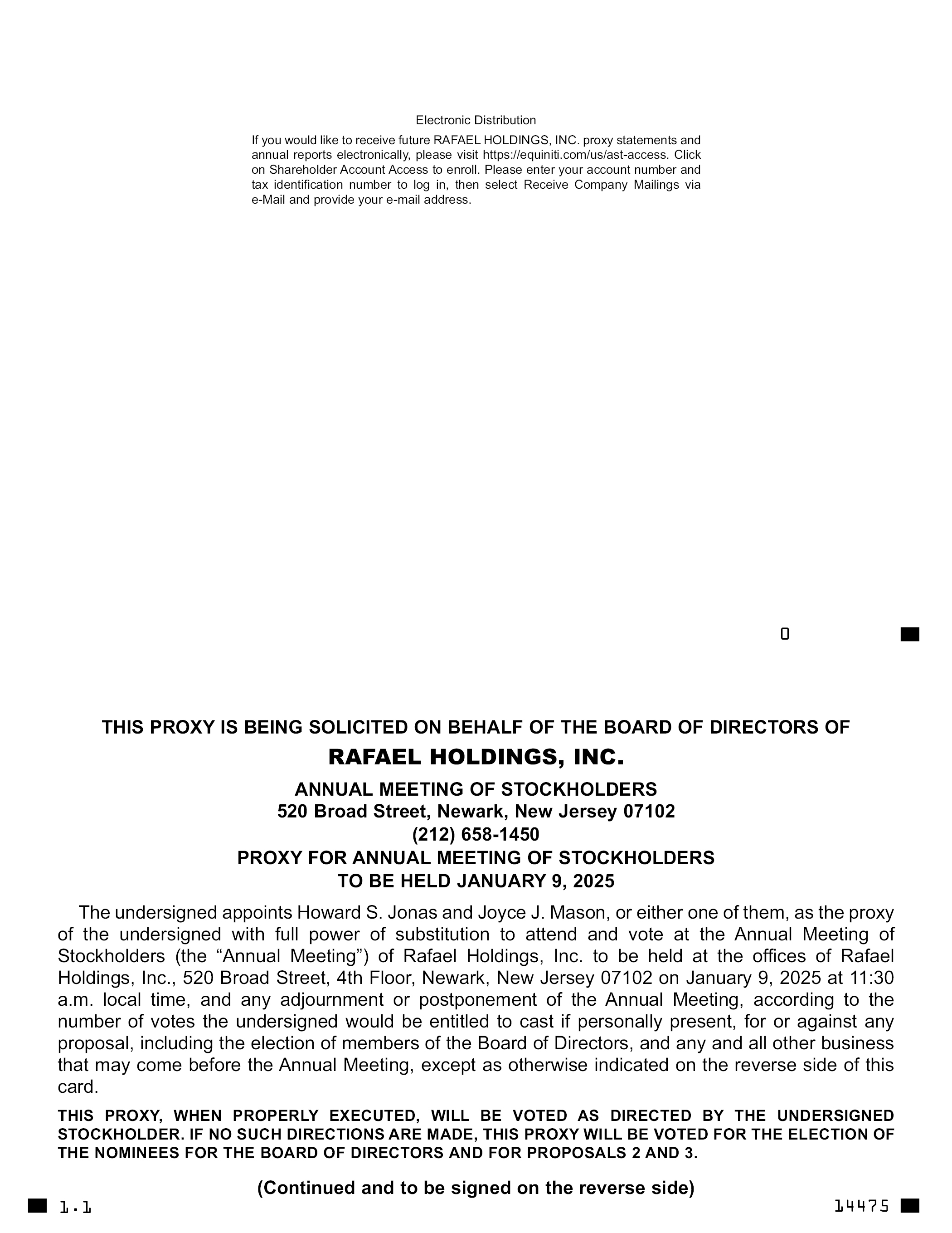 Electronic Distribution If you would like to receive future RAFAEL HOLDINGS, INC. proxy statements and annual reports electronically, please visit https://equiniti.com/us/ast-access. Click on Shareholder Account Access to enroll. Please enter your account number and tax identification number to log in, then select Receive Company Mailings via e-Mail and provide your e-mail address. 0 THIS PROXY IS BEING SOLICITED ON BEHALF OF THE BOARD OF DIRECTORS OF RAFAEL HOLDINGS, INC. ANNUAL MEETING OF STOCKHOLDERS 520 Broad Street, Newark, New Jersey 07102 (212) 658-1450 PROXY FOR ANNUAL MEETING OF STOCKHOLDERS TO BE HELD JANUARY 9, 2025 The undersigned appoints Howard S. Jonas and Joyce J. Mason, or either one of them, as the proxy of the undersigned with full power of substitution to attend and vote at the Annual Meeting of Stockholders (the “Annual Meeting”) of Rafael Holdings, Inc. to be held at the offices of Rafael Holdings, Inc., 520 Broad Street, 4th Floor, Newark, New Jersey 07102 on January 9, 2025 at 11:30 a.m. local time, and any adjournment or postponement of the Annual Meeting, according to the number of votes the undersigned would be entitled to cast if personally present, for or against any proposal, including the election of members of the Board of Directors, and any and all other business that may come before the Annual Meeting, except as otherwise indicated on the reverse side of this card. THIS PROXY, WHEN PROPERLY EXECUTED, WILL BE VOTED AS DIRECTED BY THE UNDERSIGNED STOCKHOLDER. IF NO SUCH DIRECTIONS ARE MADE, THIS PROXY WILL BE VOTED FOR THE ELECTION OF THE NOMINEES FOR THE BOARD OF DIRECTORS AND FOR PROPOSALS 2 AND 3. (Continued and to be signed on the reverse side) 1.1 14475