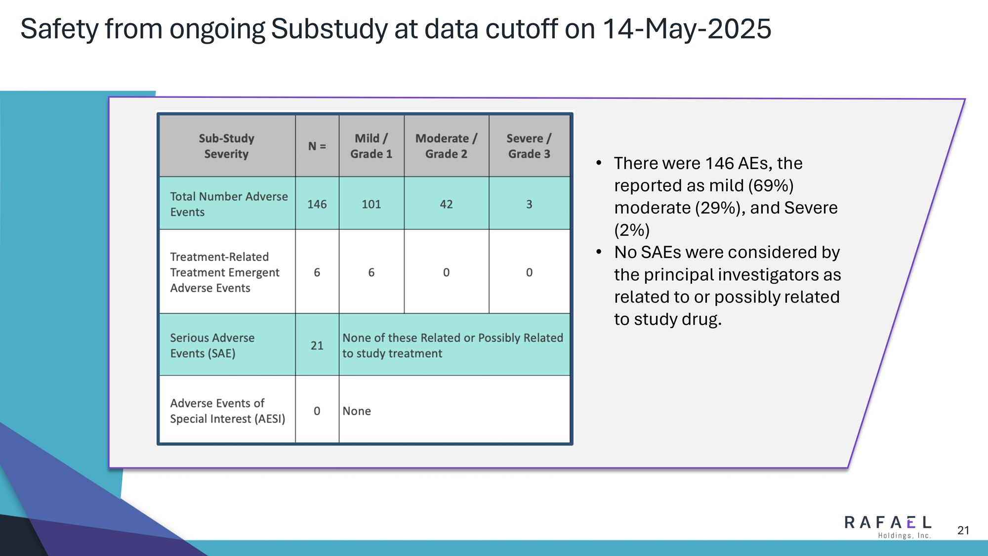 20 Clinical Global Impression – Change (CGI - C) Bar Plot at data cutoff on 14 - May - 2025 • Graphs shows individual patients (N=10) • 2 patients have withdrawn from the study at week 48 for non - safety related reasons • Trappsol ® Cyclo continues to demonstrate stabilization or improvement in the majority of patients and is well - tolerated consistent with previous studies