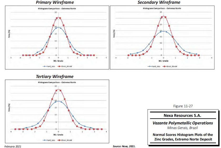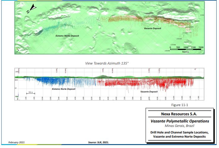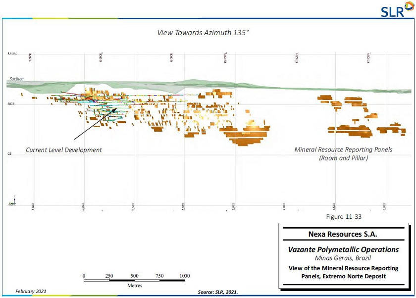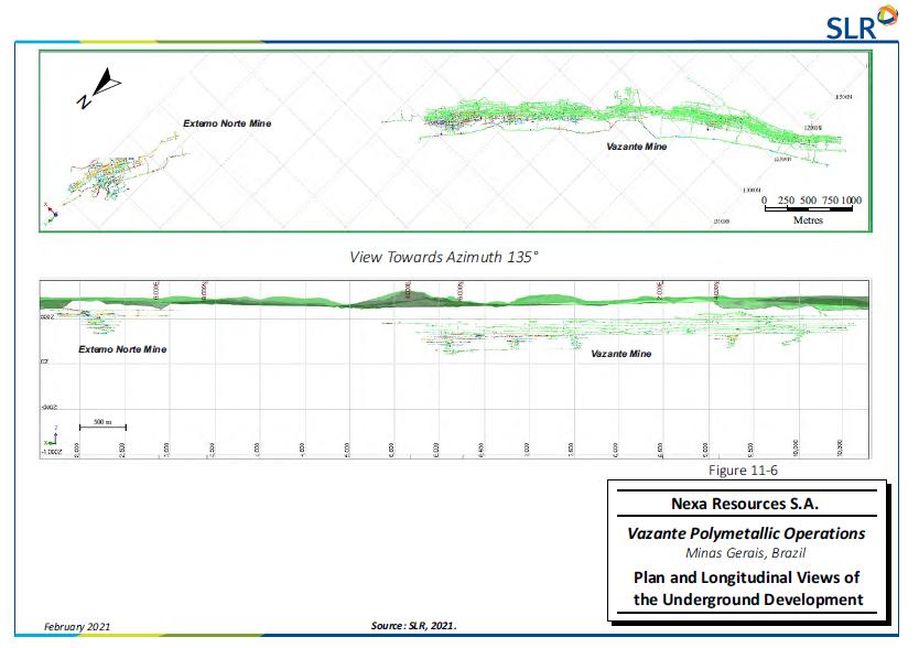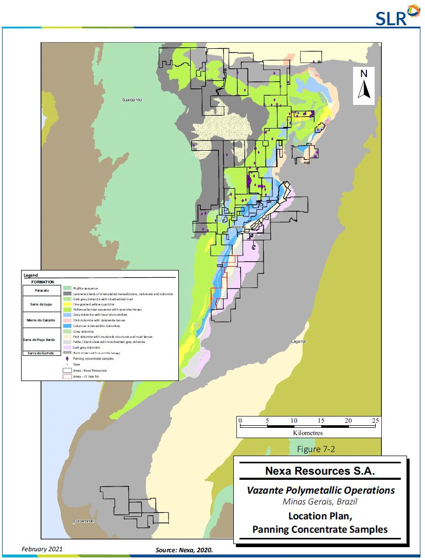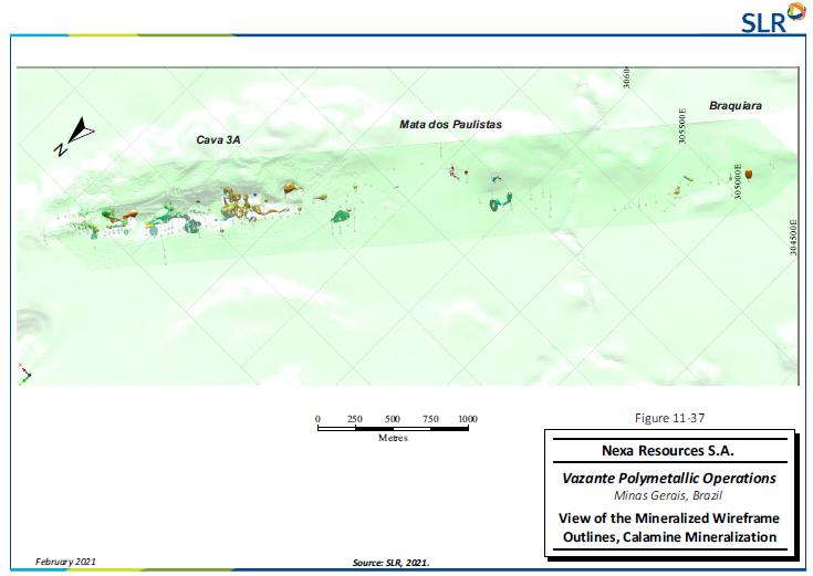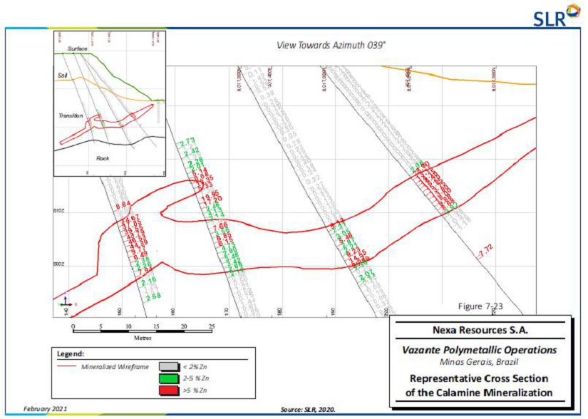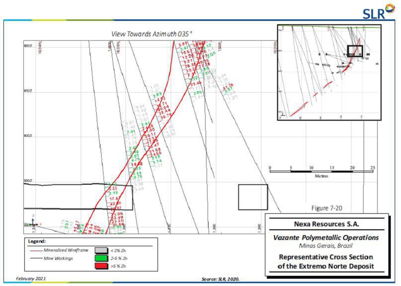 | · | As prepared by Nexa and adopted by SLR, the Vazante Measured and Indicated Mineral Resources, effective as of December 31, 2020 and exclusive of Mineral Reserves, comprise 6.3 Mt at grades of 6.88% Zn, 0.16% Pb, and 7.1 g/t Ag, containing 432.3 kt Zn, 10.2 kt Pb, and 1.44 Moz Ag. In addition, Inferred Mineral Resources comprise 13.8 Mt, at grades of 6.86% Zn, 0.18% Pb, and 9.5 g/t Ag, containing 950.2 kt Zn, 25.5 kt Pb, and 4.2 Moz Ag. |