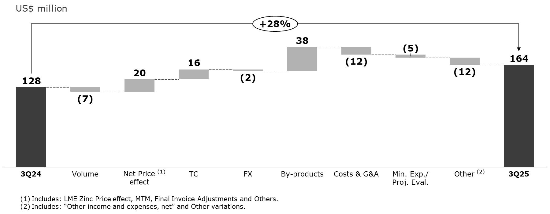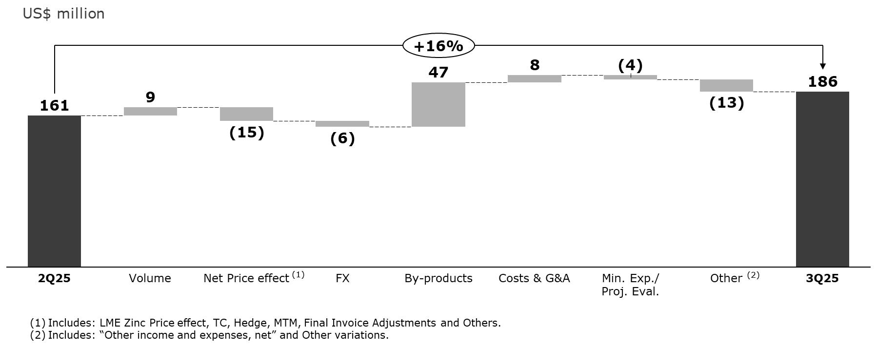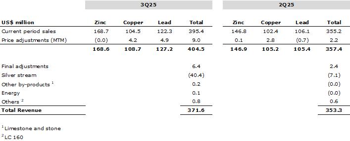 | § | The mining segment delivered strong Adjusted EBITDA of US$164 million in 3Q25, up from US$135 million in 2Q25, reflecting stronger by-products contribution and higher zinc prices. Year-over-year, mining Adjusted EBITDA rose 28%, supported by higher by-products prices (copper, silver, and gold). In 9M25, mining Adjusted EBITDA amounted to US$393 million, up 15% from prior-year period. |
