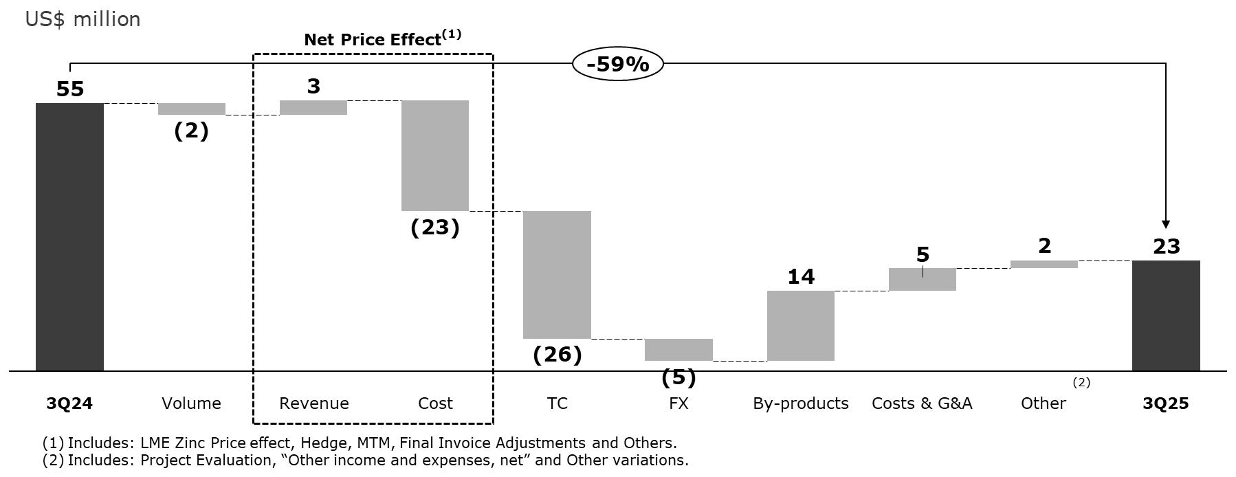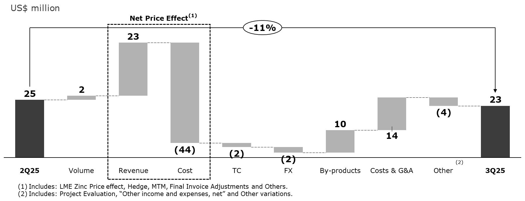 | § | Adjusted EBITDA for the smelting segment was US$23 million in 3Q25, slightly below the US$25 million reported in 2Q25, primarily due to higher raw material costs from higher zinc prices and lower TCs, partially offset by improved by-products contribution. Compared to 3Q24, smelting Adjusted EBITDA decreased 59%, primarily due to lower TCs and increased raw material costs. In 9M25, smelting Adjusted EBITDA amounted to US$79 million, down 54% from the same period a year ago. |
