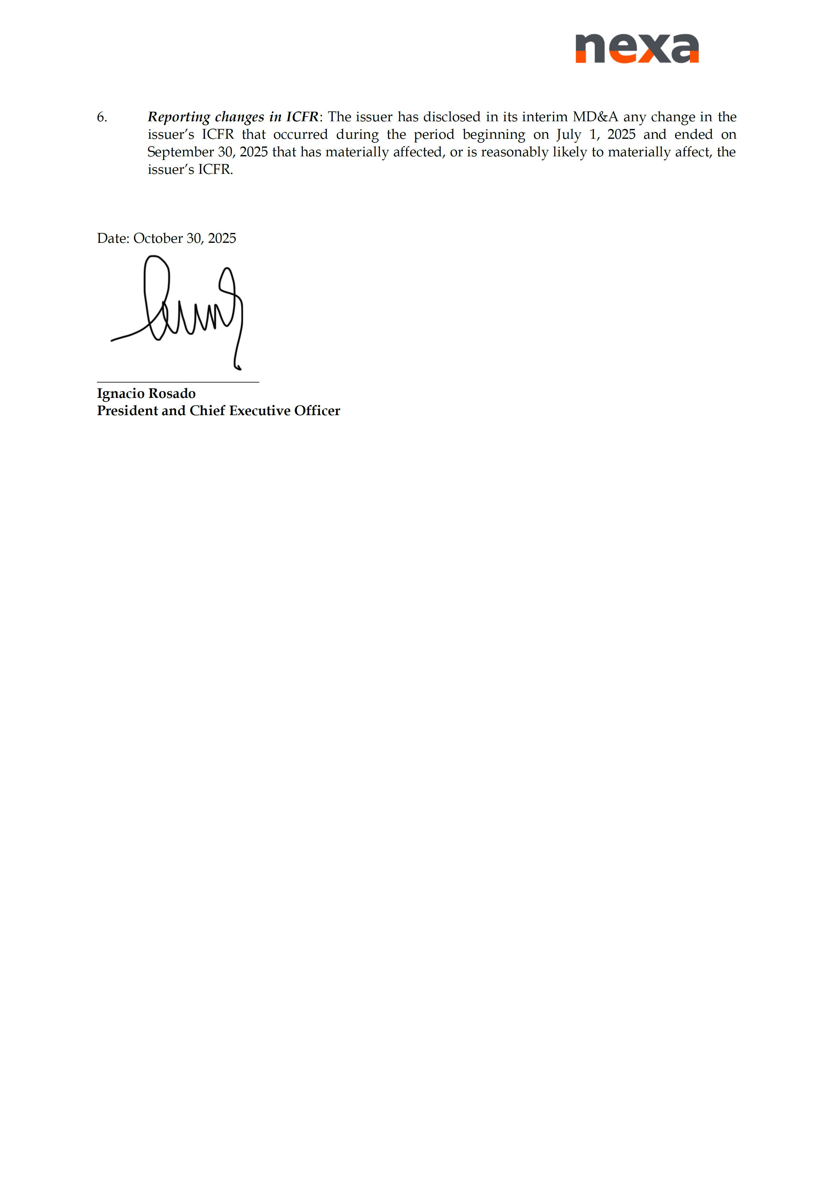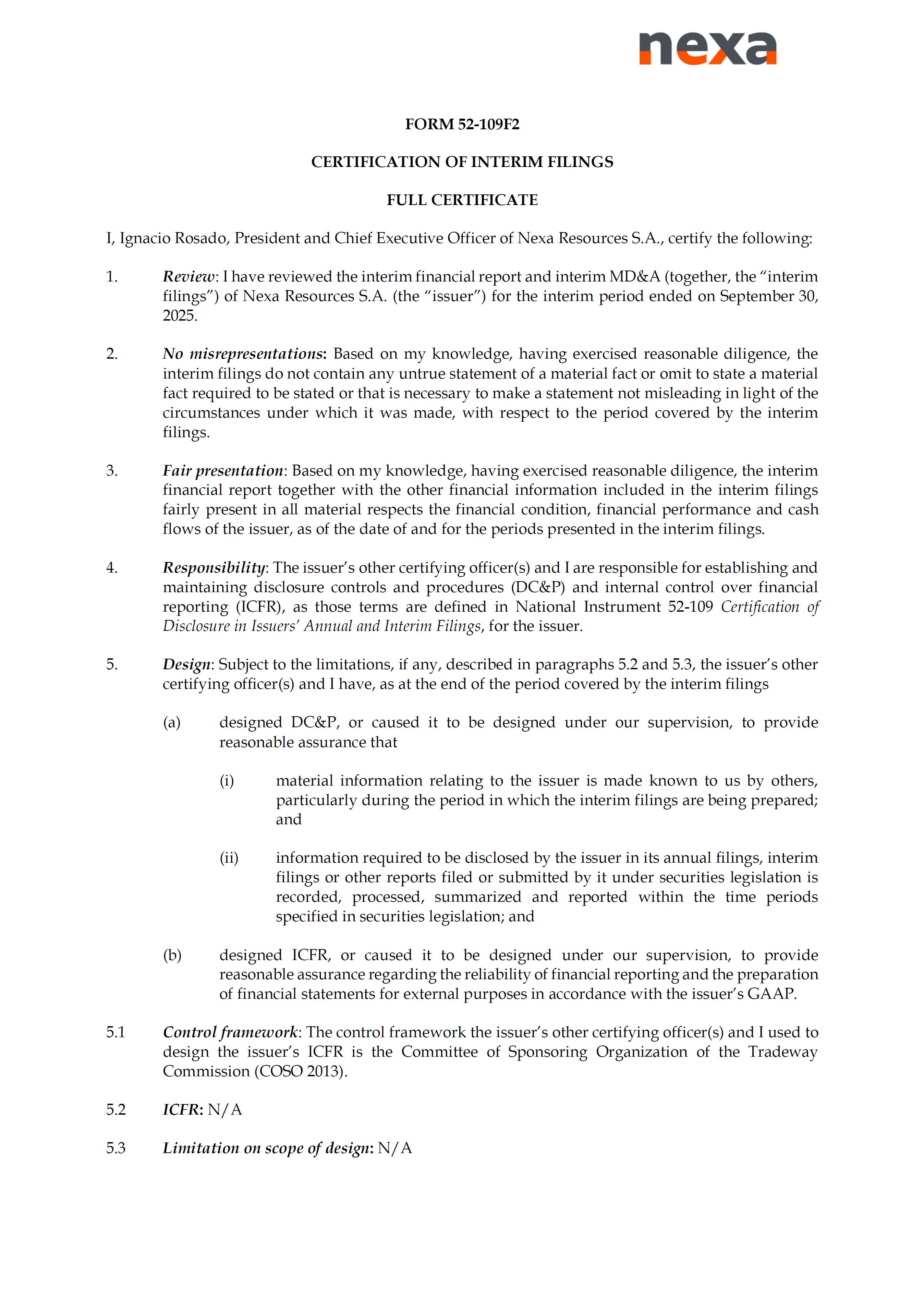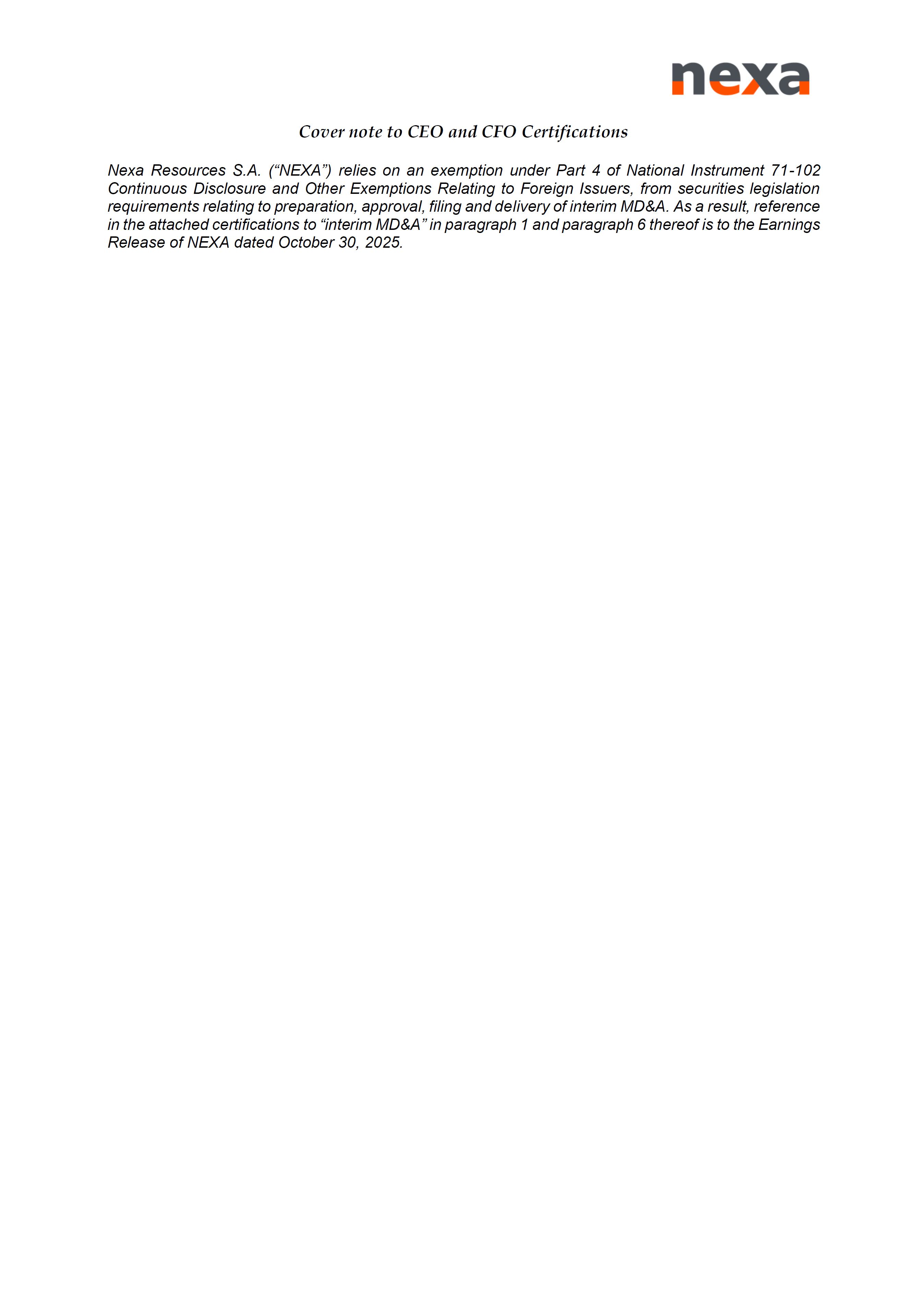 Cover note to CEO and CFO Certifications Nexa Resources S.A. (“NEXA”) relies on an exemption under Part 4 of National Instrument 71-102 Continuous Disclosure and Other Exemptions Relating to Foreign Issuers, from securities legislation requirements relating to preparation, approval, filing and delivery of interim MD&A. As a result, reference in the attached certifications to “interim MD&A” in paragraph 1 and paragraph 6 thereof is to the Earnings Release of NEXA dated October 30, 2025. FORM 52-109F2 CERTIFICATION OF INTERIM FILINGS FULL CERTIFICATE I, Ignacio Rosado, President and Chief Executive Officer of Nexa Resources S.A., certify the following: 1. Review: I have reviewed the interim financial report and interim MD&A (together, the “interim filings”) of Nexa Resources S.A. (the “issuer”) for the interim period ended on September 30, 2025. 2. No misrepresentations: Based on my knowledge, having exercised reasonable diligence, the interim filings do not contain any untrue statement of a material fact or omit to state a material fact required to be stated or that is necessary to make a statement not misleading in light of the circumstances under which it was made, with respect to the period covered by the interim filings. 3. Fair presentation: Based on my knowledge, having exercised reasonable diligence, the interim financial report together with the other financial information included in the interim filings fairly present in all material respects the financial condition, financial performance and cash flows of the issuer, as of the date of and for the periods presented in the interim filings. 4. Responsibility: The issuer’s other certifying officer(s) and I are responsible for establishing and maintaining disclosure controls and procedures (DC&P) and internal control over financial reporting (ICFR), as those terms are defined in National Instrument 52-109 Certification of Disclosure in Issuers’ Annual and Interim Filings, for the issuer. 5. Design: Subject to the limitations, if any, described in paragraphs 5.2 and 5.3, the issuer’s other certifying officer(s) and I have, as at the end of the period covered by the interim filings (a) designed DC&P, or caused it to be designed under our supervision, to provide reasonable assurance that (i) material information relating to the issuer is made known to us by others, particularly during the period in which the interim filings are being prepared; and (ii) information required to be disclosed by the issuer in its annual filings, interim filings or other reports filed or submitted by it under securities legislation is recorded, processed, summarized and reported within the time periods specified in securities legislation; and (b) designed ICFR, or caused it to be designed under our supervision, to provide reasonable assurance regarding the reliability of financial reporting and the preparation of financial statements for external purposes in accordance with the issuer’s GAAP. 5.1 Control framework: The control framework the issuer’s other certifying officer(s) and I used to design the issuer’s ICFR is the Committee of Sponsoring Organization of the Tradeway Commission (COSO 2013). 5.2 ICFR: N/A 5.3 Limitation on scope of design: N/A 6. Reporting changes in ICFR: The issuer has disclosed in its interim MD&A any change in the issuer’s ICFR that occurred during the period beginning on July 1, 2025 and ended on September 30, 2025 that has materially affected, or is reasonably likely to materially affect, the issuer’s ICFR. Date: October 30 , 2025 _______________________ Ignacio Rosado President and Chief Executive Officer