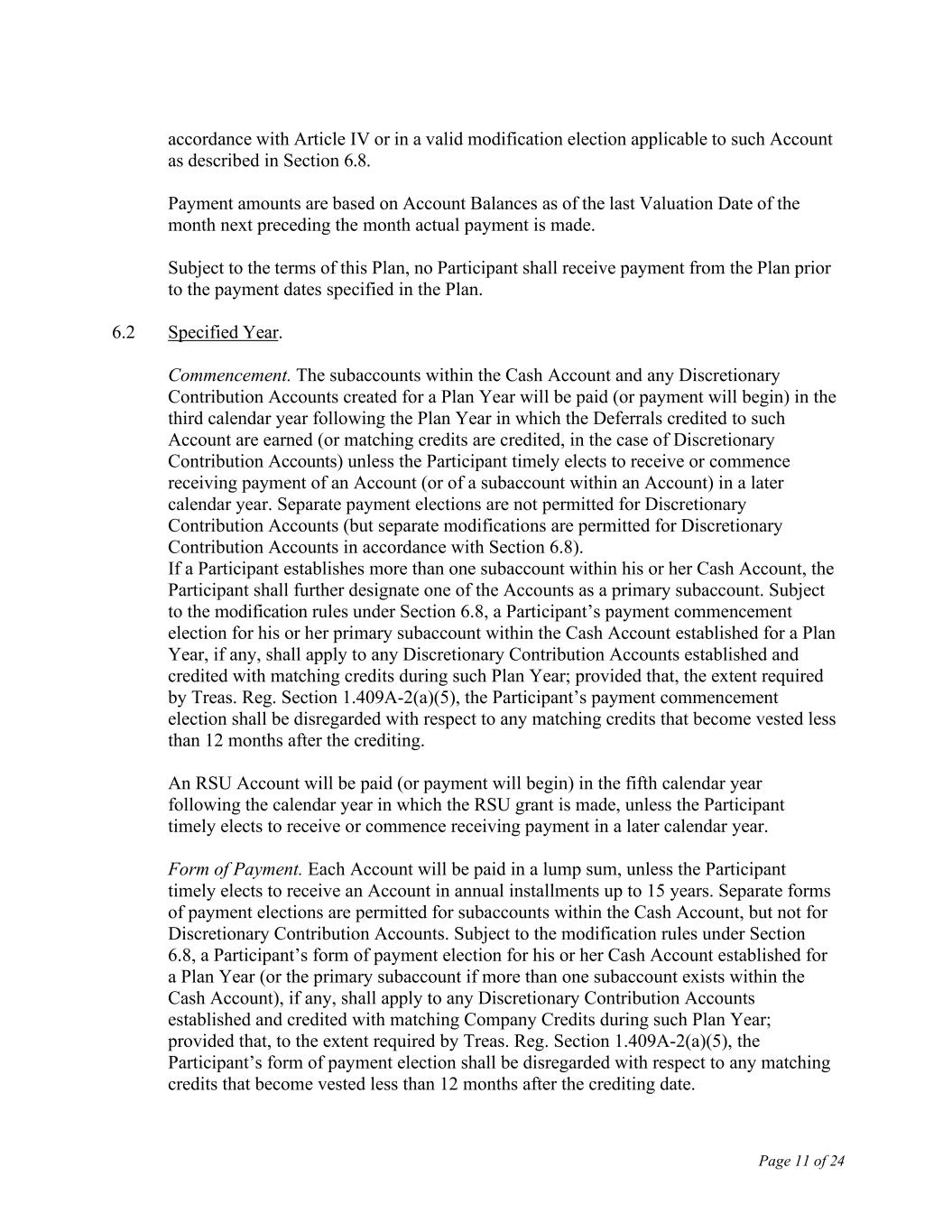 Page 11 of 24 accordance with Article IV or in a valid modification election applicable to such Account as described in Section 6.8. Payment amounts are based on Account Balances as of the last Valuation Date of the month next preceding the month actual payment is made. Subject to the terms of this Plan, no Participant shall receive payment from the Plan prior to the payment dates specified in the Plan. 6.2 Specified Year. Commencement. The subaccounts within the Cash Account and any Discretionary Contribution Accounts created for a Plan Year will be paid (or payment will begin) in the third calendar year following the Plan Year in which the Deferrals credited to such Account are earned (or matching credits are credited, in the case of Discretionary Contribution Accounts) unless the Participant timely elects to receive or commence receiving payment of an Account (or of a subaccount within an Account) in a later calendar year. Separate payment elections are not permitted for Discretionary Contribution Accounts (but separate modifications are permitted for Discretionary Contribution Accounts in accordance with Section 6.8). If a Participant establishes more than one subaccount within his or her Cash Account, the Participant shall further designate one of the Accounts as a primary subaccount. Subject to the modification rules under Section 6.8, a Participant’s payment commencement election for his or her primary subaccount within the Cash Account established for a Plan Year, if any, shall apply to any Discretionary Contribution Accounts established and credited with matching credits during such Plan Year; provided that, the extent required by Treas. Reg. Section 1.409A-2(a)(5), the Participant’s payment commencement election shall be disregarded with respect to any matching credits that become vested less than 12 months after the crediting. An RSU Account will be paid (or payment will begin) in the fifth calendar year following the calendar year in which the RSU grant is made, unless the Participant timely elects to receive or commence receiving payment in a later calendar year. Form of Payment. Each Account will be paid in a lump sum, unless the Participant timely elects to receive an Account in annual installments up to 15 years. Separate forms of payment elections are permitted for subaccounts within the Cash Account, but not for Discretionary Contribution Accounts. Subject to the modification rules under Section 6.8, a Participant’s form of payment election for his or her Cash Account established for a Plan Year (or the primary subaccount if more than one subaccount exists within the Cash Account), if any, shall apply to any Discretionary Contribution Accounts established and credited with matching Company Credits during such Plan Year; provided that, to the extent required by Treas. Reg. Section 1.409A-2(a)(5), the Participant’s form of payment election shall be disregarded with respect to any matching credits that become vested less than 12 months after the crediting date.