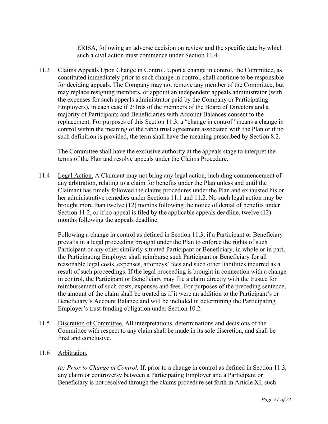 Page 21 of 24 ERISA, following an adverse decision on review and the specific date by which such a civil action must commence under Section 11.4. 11.3 Claims Appeals Upon Change in Control. Upon a change in control, the Committee, as constituted immediately prior to such change in control, shall continue to be responsible for deciding appeals. The Company may not remove any member of the Committee, but may replace resigning members, or appoint an independent appeals administrator (with the expenses for such appeals administrator paid by the Company or Participating Employers), in each case if 2/3rds of the members of the Board of Directors and a majority of Participants and Beneficiaries with Account Balances consent to the replacement. For purposes of this Section 11.3, a “change in control” means a change in control within the meaning of the rabbi trust agreement associated with the Plan or if no such definition is provided, the term shall have the meaning prescribed by Section 8.2. The Committee shall have the exclusive authority at the appeals stage to interpret the terms of the Plan and resolve appeals under the Claims Procedure. 11.4 Legal Action. A Claimant may not bring any legal action, including commencement of any arbitration, relating to a claim for benefits under the Plan unless and until the Claimant has timely followed the claims procedures under the Plan and exhausted his or her administrative remedies under Sections 11.1 and 11.2. No such legal action may be brought more than twelve (12) months following the notice of denial of benefits under Section 11.2, or if no appeal is filed by the applicable appeals deadline, twelve (12) months following the appeals deadline. Following a change in control as defined in Section 11.3, if a Participant or Beneficiary prevails in a legal proceeding brought under the Plan to enforce the rights of such Participant or any other similarly situated Participant or Beneficiary, in whole or in part, the Participating Employer shall reimburse such Participant or Beneficiary for all reasonable legal costs, expenses, attorneys’ fees and such other liabilities incurred as a result of such proceedings. If the legal proceeding is brought in connection with a change in control, the Participant or Beneficiary may file a claim directly with the trustee for reimbursement of such costs, expenses and fees. For purposes of the preceding sentence, the amount of the claim shall be treated as if it were an addition to the Participant’s or Beneficiary’s Account Balance and will be included in determining the Participating Employer’s trust funding obligation under Section 10.2. 11.5 Discretion of Committee. All interpretations, determinations and decisions of the Committee with respect to any claim shall be made in its sole discretion, and shall be final and conclusive. 11.6 Arbitration. (a) Prior to Change in Control. If, prior to a change in control as defined in Section 11.3, any claim or controversy between a Participating Employer and a Participant or Beneficiary is not resolved through the claims procedure set forth in Article XI, such