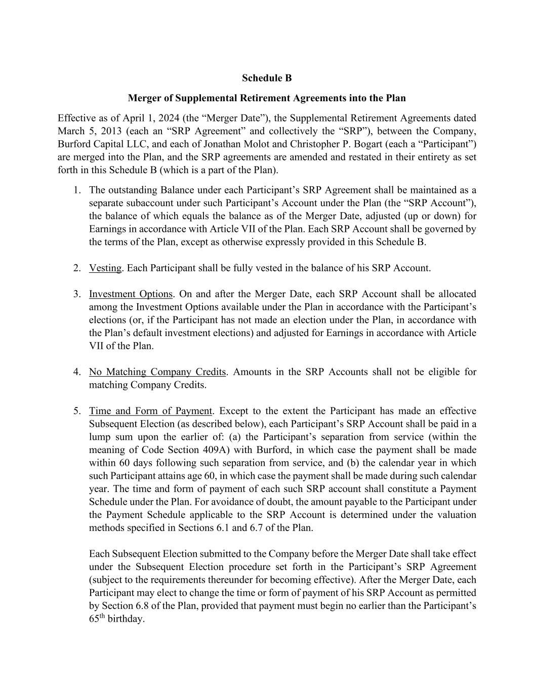 Schedule B Merger of Supplemental Retirement Agreements into the Plan Effective as of April 1, 2024 (the “Merger Date”), the Supplemental Retirement Agreements dated March 5, 2013 (each an “SRP Agreement” and collectively the “SRP”), between the Company, Burford Capital LLC, and each of Jonathan Molot and Christopher P. Bogart (each a “Participant”) are merged into the Plan, and the SRP agreements are amended and restated in their entirety as set forth in this Schedule B (which is a part of the Plan). 1. The outstanding Balance under each Participant’s SRP Agreement shall be maintained as a separate subaccount under such Participant’s Account under the Plan (the “SRP Account”), the balance of which equals the balance as of the Merger Date, adjusted (up or down) for Earnings in accordance with Article VII of the Plan. Each SRP Account shall be governed by the terms of the Plan, except as otherwise expressly provided in this Schedule B. 2. Vesting. Each Participant shall be fully vested in the balance of his SRP Account. 3. Investment Options. On and after the Merger Date, each SRP Account shall be allocated among the Investment Options available under the Plan in accordance with the Participant’s elections (or, if the Participant has not made an election under the Plan, in accordance with the Plan’s default investment elections) and adjusted for Earnings in accordance with Article VII of the Plan. 4. No Matching Company Credits. Amounts in the SRP Accounts shall not be eligible for matching Company Credits. 5. Time and Form of Payment. Except to the extent the Participant has made an effective Subsequent Election (as described below), each Participant’s SRP Account shall be paid in a lump sum upon the earlier of: (a) the Participant’s separation from service (within the meaning of Code Section 409A) with Burford, in which case the payment shall be made within 60 days following such separation from service, and (b) the calendar year in which such Participant attains age 60, in which case the payment shall be made during such calendar year. The time and form of payment of each such SRP account shall constitute a Payment Schedule under the Plan. For avoidance of doubt, the amount payable to the Participant under the Payment Schedule applicable to the SRP Account is determined under the valuation methods specified in Sections 6.1 and 6.7 of the Plan. Each Subsequent Election submitted to the Company before the Merger Date shall take effect under the Subsequent Election procedure set forth in the Participant’s SRP Agreement (subject to the requirements thereunder for becoming effective). After the Merger Date, each Participant may elect to change the time or form of payment of his SRP Account as permitted by Section 6.8 of the Plan, provided that payment must begin no earlier than the Participant’s 65th birthday.