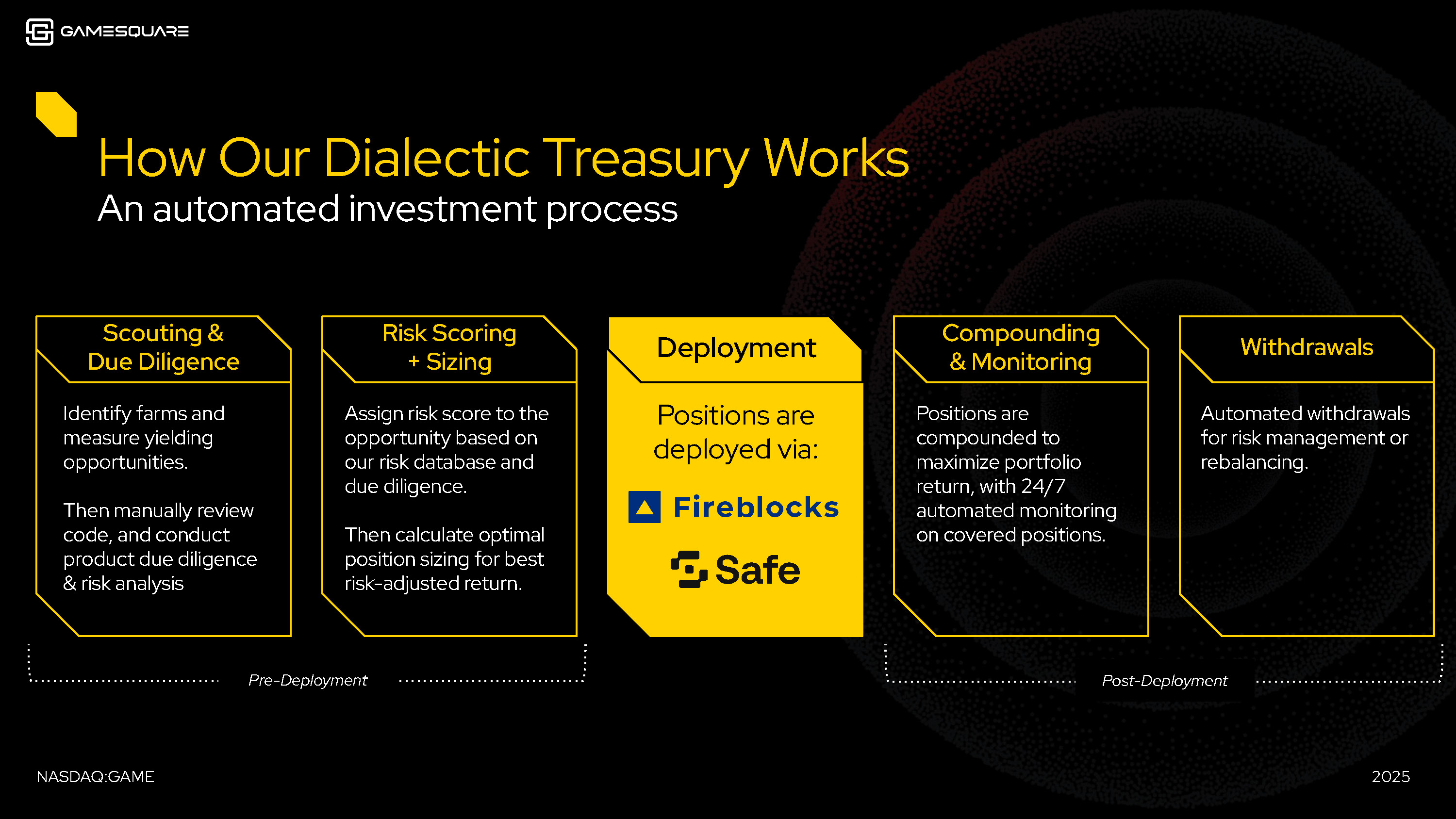 As legislative clarity around stable coins, protocols and digital assets began to emerge, we thought the timing was right to formally launch our treasury management strategy supported by Rhydon at Goff Capital Management, who has become a strategic adviser to GamesSquare and Ryan Zurrer at Dialectic who is managing our treasury strategy.