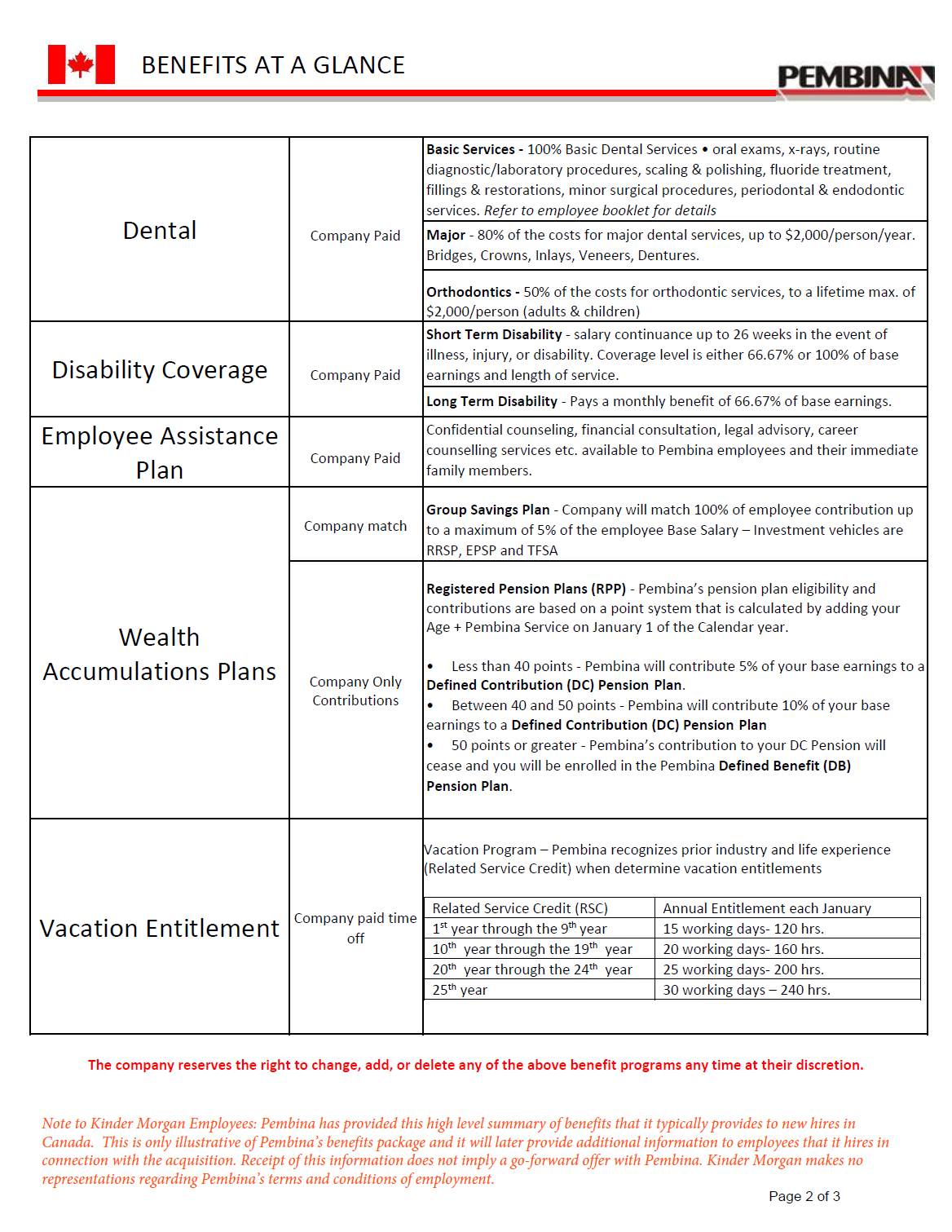 BENEFITS AT A GLANCE earnings and length of service. counselling services etc. available to Pembina employees and their immediate Defined Contribution (DC) Pension Plan. The company reserves the right to change, add, or delete any of the above benefit programs any time at their discretion. Note to Kinder Morgan Employees: Pembina has provided this high level summary of benefits that it typically provides to new hires in Canada. This is only illustrative of Pembina’s benefits package and it will later provide additional information to employees that it hires in connection with the acquisition. Receipt of this information does not imply a go-forward offer with Pembina. Kinder Morgan makes no representations regarding Pembina’s terms and conditions of employment. Page 2 of 3 Dental Company Paid Basic Services - 100% Basic Dental Services • oral exams, x-rays, routine diagnostic/laboratory procedures, scaling & polishing, fluoride treatment, fillings & restorations, minor surgical procedures, periodontal & endodontic services. Refer to employee booklet for details Major - 80% of the costs for major dental services, up to $2,000/person/year. Bridges, Crowns, Inlays, Veneers, Dentures. Orthodontics - 50% of the costs for orthodontic services, to a lifetime max. of $2,000/person (adults & children) Disability Coverage Company Paid Short Term Disability - salary continuance up to 26 weeks in the event of illness, injury, or disability. Coverage level is either 66.67% or 100% of base Long Term Disability - Pays a monthly benefit of 66.67% of base earnings. Employee Assistance Plan Company Paid Confidential counseling, financial consultation, legal advisory, career family members. Wealth Accumulations Plans Company match Group Savings Plan - Company will match 100% of employee contribution up to a maximum of 5% of the employee Base Salary – Investment vehicles are RRSP, EPSP and TFSA Company Only Contributions Registered Pension Plans (RPP) - Pembina’s pension plan eligibility and contributions are based on a point system that is calculated by adding your Age + Pembina Service on January 1 of the Calendar year. •Less than 40 points - Pembina will contribute 5% of your base earnings to a •Between 40 and 50 points - Pembina will contribute 10% of your base earnings to a Defined Contribution (DC) Pension Plan •50 points or greater - Pembina’s contribution to your DC Pension will cease and you will be enrolled in the Pembina Defined Benefit (DB) Pension Plan. Vacation Entitlement Company paid time off Vacation Program – Pembina recognizes prior industry and life experience (Related Service Credit) when determine vacation entitlements Related Service Credit (RSC) Annual Entitlement each January 1st year through the 9th year 15 working days-120 hrs. 10th year through the 19th year 20 working days-160 hrs. 20th year through the 24th year 25 working days-200 hrs. 25th year 30 working days – 240 hrs.