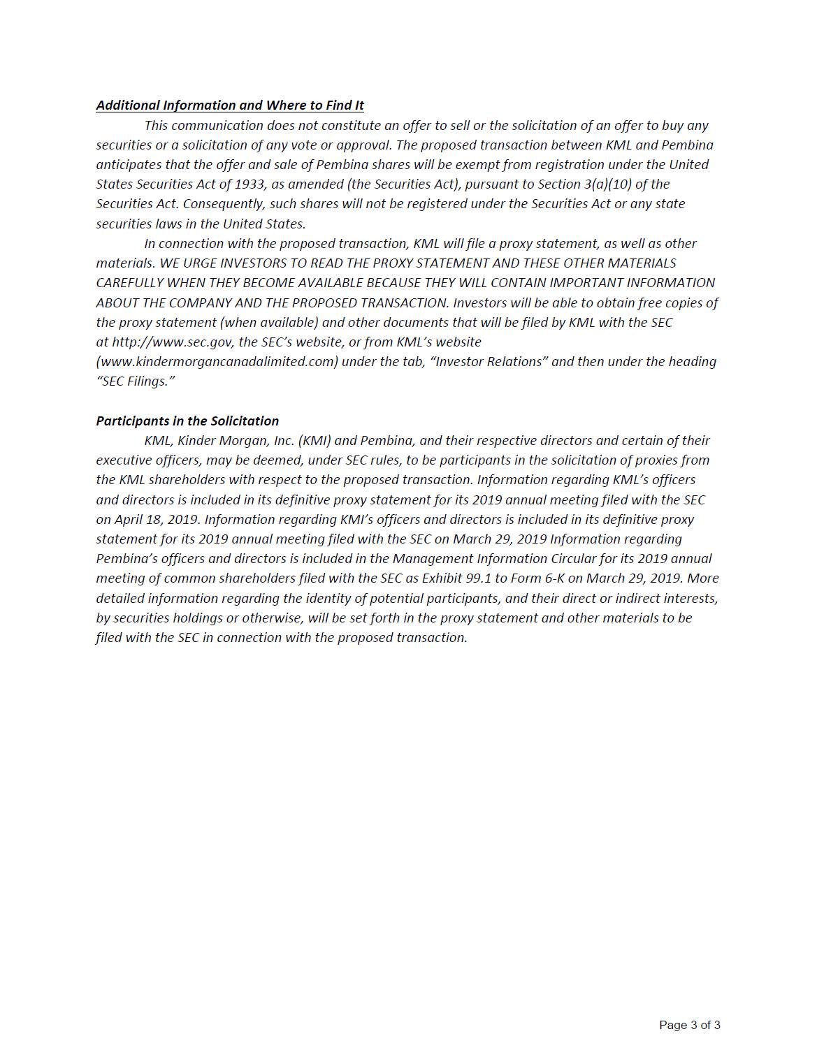 Additional Information and Where to Find It This communication does not constitute an offer to sell or the solicitation of an offer to buy any securities or a solicitation of any vote or approval. The proposed transaction between KML and Pembina anticipates that the offer and sale of Pembina shares will be exempt from registration under the United States Securities Act of 1933, as amended (the Securities Act), pursuant to Section 3(a)(10) of the Securities Act. Consequently, such shares will not be registered under the Securities Act or any state securities laws in the United States. In connection with the proposed transaction, KML will file a proxy statement, as well as other materials. WE URGE INVESTORS TO READ THE PROXY STATEMENT AND THESE OTHER MATERIALS CAREFULLY WHEN THEY BECOME AVAILABLE BECAUSE THEY WILL CONTAIN IMPORTANT INFORMATION ABOUT THE COMPANY AND THE PROPOSED TRANSACTION. Investors will be able to obtain free copies of the proxy statement (when available) and other documents that will be filed by KML with the SEC at http://www.sec.gov, the SEC’s website, or from KML’s website (www.kindermorgancanadalimited.com) under the tab, “Investor Relations” and then under the heading “SEC Filings.” Participants in the Solicitation KML, Kinder Morgan, Inc. (KMI) and Pembina, and their respective directors and certain of their executive officers, may be deemed, under SEC rules, to be participants in the solicitation of proxies from the KML shareholders with respect to the proposed transaction. Information regarding KML’s officers and directors is included in its definitive proxy statement for its 2019 annual meeting filed with the SEC on April 18, 2019. Information regarding KMI’s officers and directors is included in its definitive proxy statement for its 2019 annual meeting filed with the SEC on March 29, 2019 Information regarding Pembina’s officers and directors is included in the Management Information Circular for its 2019 annual meeting of common shareholders filed with the SEC as Exhibit 99.1 to Form 6-K on March 29, 2019. More detailed information regarding the identity of potential participants, and their direct or indirect interests, by securities holdings or otherwise, will be set forth in the proxy statement and other materials to be filed with the SEC in connection with the proposed transaction. Page 3 of 3