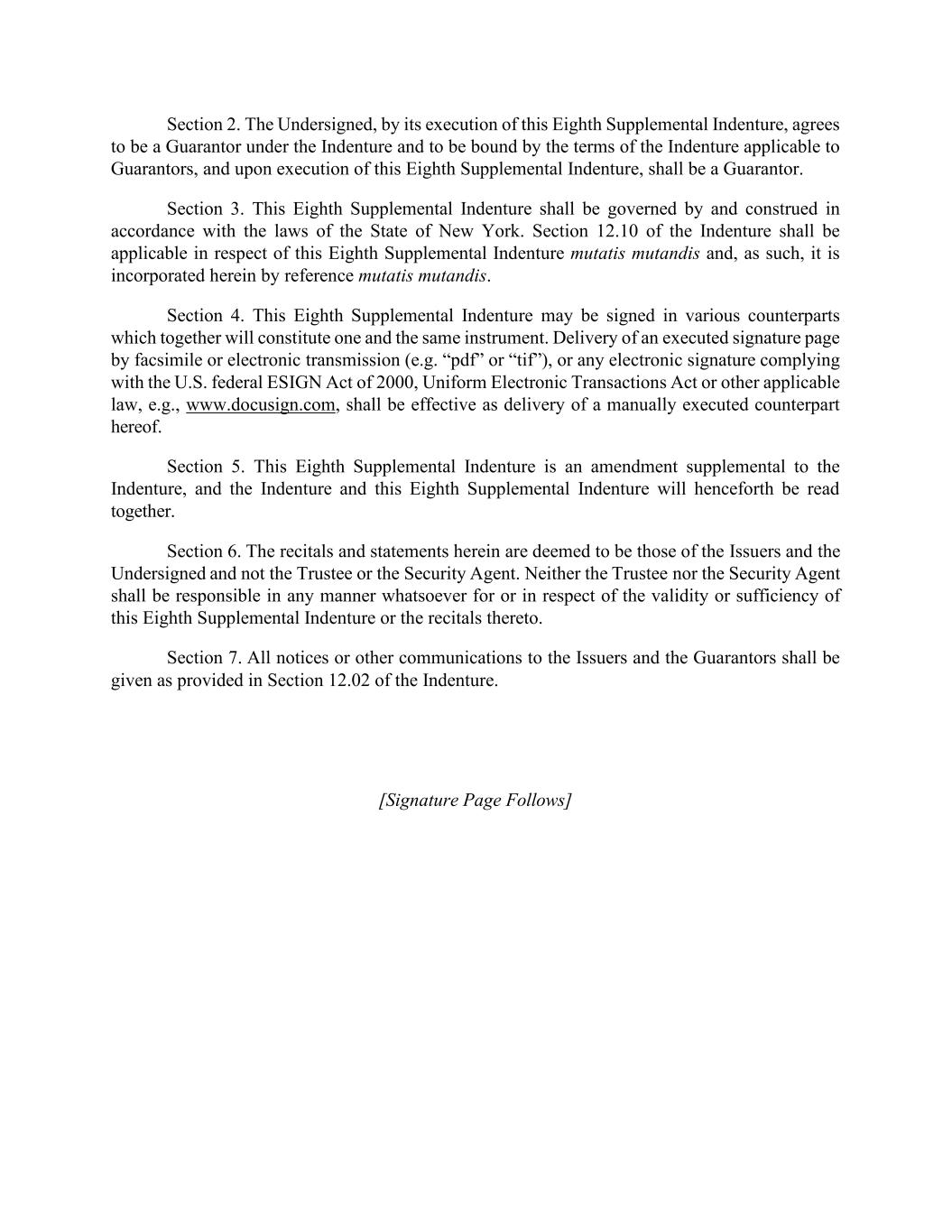 Section 2. The Undersigned, by its execution of this Eighth Supplemental Indenture, agrees to be a Guarantor under the Indenture and to be bound by the terms of the Indenture applicable to Guarantors, and upon execution of this Eighth Supplemental Indenture, shall be a Guarantor. Section 3. This Eighth Supplemental Indenture shall be governed by and construed in accordance with the laws of the State of New York. Section 12.10 of the Indenture shall be applicable in respect of this Eighth Supplemental Indenture mutatis mutandis and, as such, it is incorporated herein by reference mutatis mutandis. Section 4. This Eighth Supplemental Indenture may be signed in various counterparts which together will constitute one and the same instrument. Delivery of an executed signature page by facsimile or electronic transmission (e.g. “pdf” or “tif”), or any electronic signature complying with the U.S. federal ESIGN Act of 2000, Uniform Electronic Transactions Act or other applicable law, e.g., www.docusign.com, shall be effective as delivery of a manually executed counterpart hereof. Section 5. This Eighth Supplemental Indenture is an amendment supplemental to the Indenture, and the Indenture and this Eighth Supplemental Indenture will henceforth be read together. Section 6. The recitals and statements herein are deemed to be those of the Issuers and the Undersigned and not the Trustee or the Security Agent. Neither the Trustee nor the Security Agent shall be responsible in any manner whatsoever for or in respect of the validity or sufficiency of this Eighth Supplemental Indenture or the recitals thereto. Section 7. All notices or other communications to the Issuers and the Guarantors shall be given as provided in Section 12.02 of the Indenture. [Signature Page Follows]