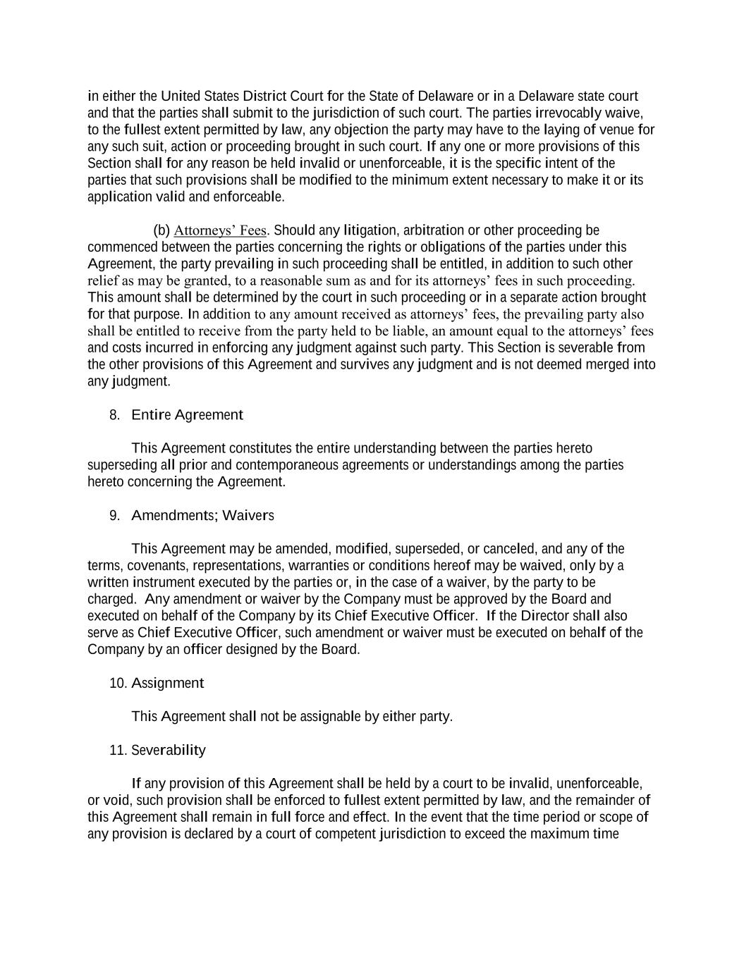 in either the United States District Court for the State of Delaware or in a Delaware state court and that the parties shall submit to the jurisdiction of such court. The parties irrevocably waive, to the fullest extent permitted by law, any objection the party may have to the laying of venue for any such suit, action or proceeding brought in such court. If any one or more provisions of this Section shall for any reason be held invalid or unenforceable, it is the specific intent of the parties that such provisions shall be modified to the minimum extent necessary to make it or its application valid and enforceable. (b) Attorneys’ Fees. Should any litigation, arbitration or other proceeding be commenced between the parties concerning the rights or obligations of the parties under this Agreement, the party prevailing in such proceeding shall be entitled, in addition to such other relief as may be granted, to a reasonable sum as and for its attorneys’ fees in such proceeding. This amount shall be determined by the court in such proceeding or in a separate action brought for that purpose. In addition to any amount received as attorneys’ fees, the prevailing party also shall be entitled to receive from the party held to be liable, an amount equal to the attorneys’ fees and costs incurred in enforcing any judgment against such party. This Section is severable from the other provisions of this Agreement and survives any judgment and is not deemed merged into any judgment. 8. Entire Agreement This Agreement constitutes the entire understanding between the parties hereto superseding all prior and contemporaneous agreements or understandings among the parties hereto concerning the Agreement. 9. Amendments; Waivers This Agreement may be amended, modified, superseded, or canceled, and any of the terms, covenants, representations, warranties or conditions hereof may be waived, only by a written instrument executed by the parties or, in the case of a waiver, by the party to be charged. Any amendment or waiver by the Company must be approved by the Board and executed on behalf of the Company by its Chief Executive Officer. If the Director shall also serve as Chief Executive Officer, such amendment or waiver must be executed on behalf of the Company by an officer designed by the Board. 10. Assignment This Agreement shall not be assignable by either party. 11. Severability If any provision of this Agreement shall be held by a court to be invalid, unenforceable, or void, such provision shall be enforced to fullest extent permitted by law, and the remainder of this Agreement shall remain in full force and effect. In the event that the time period or scope of any provision is declared by a court of competent jurisdiction to exceed the maximum time DocuSign Envelope ID: 5F2AF94B-B28C-4D32-B27F-364017D49B84