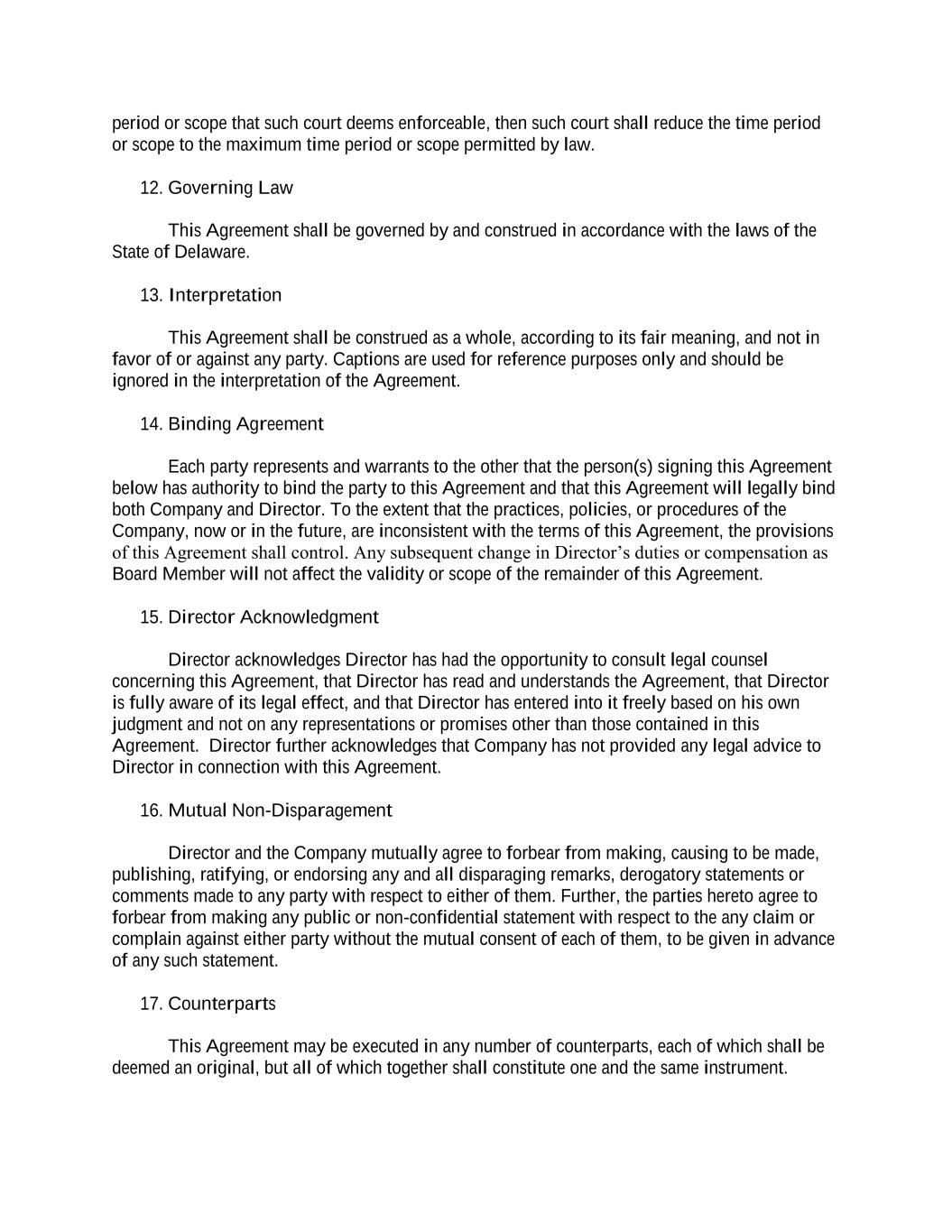 period or scope that such court deems enforceable, then such court shall reduce the time period or scope to the maximum time period or scope permitted by law. 12. Governing Law This Agreement shall be governed by and construed in accordance with the laws of the State of Delaware. 13. Interpretation This Agreement shall be construed as a whole, according to its fair meaning, and not in favor of or against any party. Captions are used for reference purposes only and should be ignored in the interpretation of the Agreement. 14. Binding Agreement Each party represents and warrants to the other that the person(s) signing this Agreement below has authority to bind the party to this Agreement and that this Agreement will legally bind both Company and Director. To the extent that the practices, policies, or procedures of the Company, now or in the future, are inconsistent with the terms of this Agreement, the provisions of this Agreement shall control. Any subsequent change in Director’s duties or compensation as Board Member will not affect the validity or scope of the remainder of this Agreement. 15. Director Acknowledgment Director acknowledges Director has had the opportunity to consult legal counsel concerning this Agreement, that Director has read and understands the Agreement, that Director is fully aware of its legal effect, and that Director has entered into it freely based on his own judgment and not on any representations or promises other than those contained in this Agreement. Director further acknowledges that Company has not provided any legal advice to Director in connection with this Agreement. 16. Mutual Non-Disparagement Director and the Company mutually agree to forbear from making, causing to be made, publishing, ratifying, or endorsing any and all disparaging remarks, derogatory statements or comments made to any party with respect to either of them. Further, the parties hereto agree to forbear from making any public or non-confidential statement with respect to the any claim or complain against either party without the mutual consent of each of them, to be given in advance of any such statement. 17. Counterparts This Agreement may be executed in any number of counterparts, each of which shall be deemed an original, but all of which together shall constitute one and the same instrument. DocuSign Envelope ID: 5F2AF94B-B28C-4D32-B27F-364017D49B84