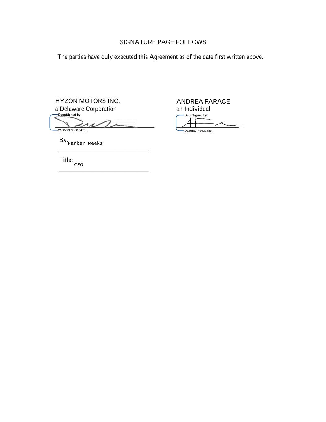 SIGNATURE PAGE FOLLOWS The parties have duly executed this Agreement as of the date first written above. HYZON MOTORS INC. ANDREA FARACE a Delaware Corporation an Individual By: ____________________________ Title: ____________________________ DocuSign Envelope ID: 5F2AF94B-B28C-4D32-B27F-364017D49B84 CEO Parker Meeks