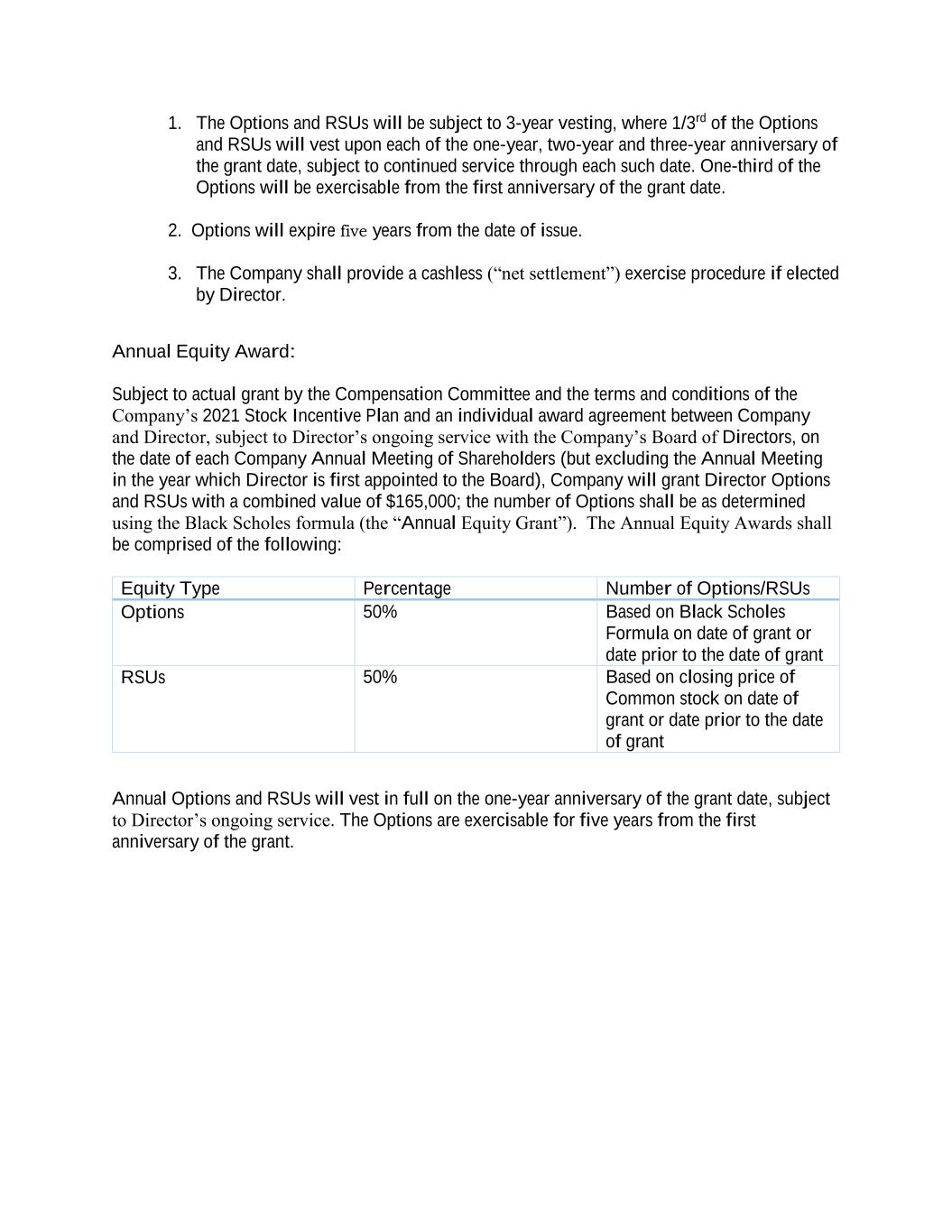 1. The Options and RSUs will be subject to 3-year vesting, where 1/3rd of the Options and RSUs will vest upon each of the one-year, two-year and three-year anniversary of the grant date, subject to continued service through each such date. One-third of the Options will be exercisable from the first anniversary of the grant date. 2. Options will expire five years from the date of issue. 3. The Company shall provide a cashless (“net settlement”) exercise procedure if elected by Director. Annual Equity Award: Subject to actual grant by the Compensation Committee and the terms and conditions of the Company’s 2021 Stock Incentive Plan and an individual award agreement between Company and Director, subject to Director’s ongoing service with the Company’s Board of Directors, on the date of each Company Annual Meeting of Shareholders (but excluding the Annual Meeting in the year which Director is first appointed to the Board), Company will grant Director Options and RSUs with a combined value of $165,000; the number of Options shall be as determined using the Black Scholes formula (the “Annual Equity Grant”). The Annual Equity Awards shall be comprised of the following: Equity Type Percentage Number of Options/RSUs Options 50% Based on Black Scholes Formula on date of grant or date prior to the date of grant RSUs 50% Based on closing price of Common stock on date of grant or date prior to the date of grant Annual Options and RSUs will vest in full on the one-year anniversary of the grant date, subject to Director’s ongoing service. The Options are exercisable for five years from the first anniversary of the grant. DocuSign Envelope ID: 5F2AF94B-B28C-4D32-B27F-364017D49B84
