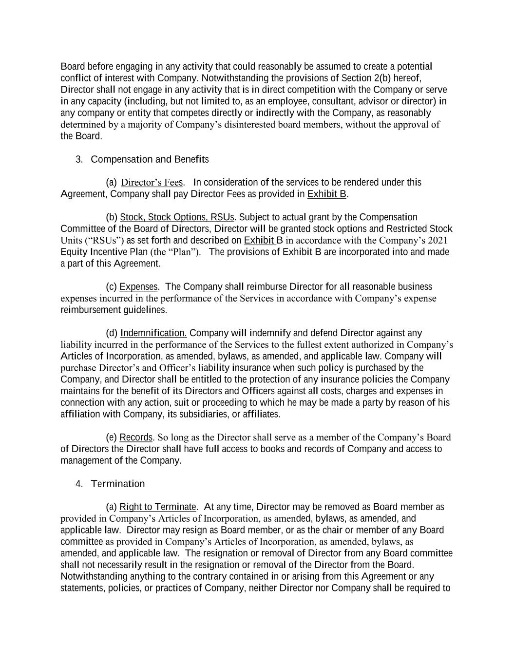 Board before engaging in any activity that could reasonably be assumed to create a potential conflict of interest with Company. Notwithstanding the provisions of Section 2(b) hereof, Director shall not engage in any activity that is in direct competition with the Company or serve in any capacity (including, but not limited to, as an employee, consultant, advisor or director) in any company or entity that competes directly or indirectly with the Company, as reasonably determined by a majority of Company’s disinterested board members, without the approval of the Board. 3. Compensation and Benefits (a) Director’s Fees. In consideration of the services to be rendered under this Agreement, Company shall pay Director Fees as provided in Exhibit B. (b) Stock, Stock Options, RSUs. Subject to actual grant by the Compensation Committee of the Board of Directors, Director will be granted stock options and Restricted Stock Units (“RSUs”) as set forth and described on Exhibit B in accordance with the Company’s 2021 Equity Incentive Plan (the “Plan”). The provisions of Exhibit B are incorporated into and made a part of this Agreement. (c) Expenses. The Company shall reimburse Director for all reasonable business expenses incurred in the performance of the Services in accordance with Company’s expense reimbursement guidelines. (d) Indemnification. Company will indemnify and defend Director against any liability incurred in the performance of the Services to the fullest extent authorized in Company’s Articles of Incorporation, as amended, bylaws, as amended, and applicable law. Company will purchase Director’s and Officer’s liability insurance when such policy is purchased by the Company, and Director shall be entitled to the protection of any insurance policies the Company maintains for the benefit of its Directors and Officers against all costs, charges and expenses in connection with any action, suit or proceeding to which he may be made a party by reason of his affiliation with Company, its subsidiaries, or affiliates. (e) Records. So long as the Director shall serve as a member of the Company’s Board of Directors the Director shall have full access to books and records of Company and access to management of the Company. 4. Termination (a) Right to Terminate. At any time, Director may be removed as Board member as provided in Company’s Articles of Incorporation, as amended, bylaws, as amended, and applicable law. Director may resign as Board member, or as the chair or member of any Board committee as provided in Company’s Articles of Incorporation, as amended, bylaws, as amended, and applicable law. The resignation or removal of Director from any Board committee shall not necessarily result in the resignation or removal of the Director from the Board. Notwithstanding anything to the contrary contained in or arising from this Agreement or any statements, policies, or practices of Company, neither Director nor Company shall be required to DocuSign Envelope ID: 5355FCC4-8252-4ABF-9403-FEC94E16B3E9