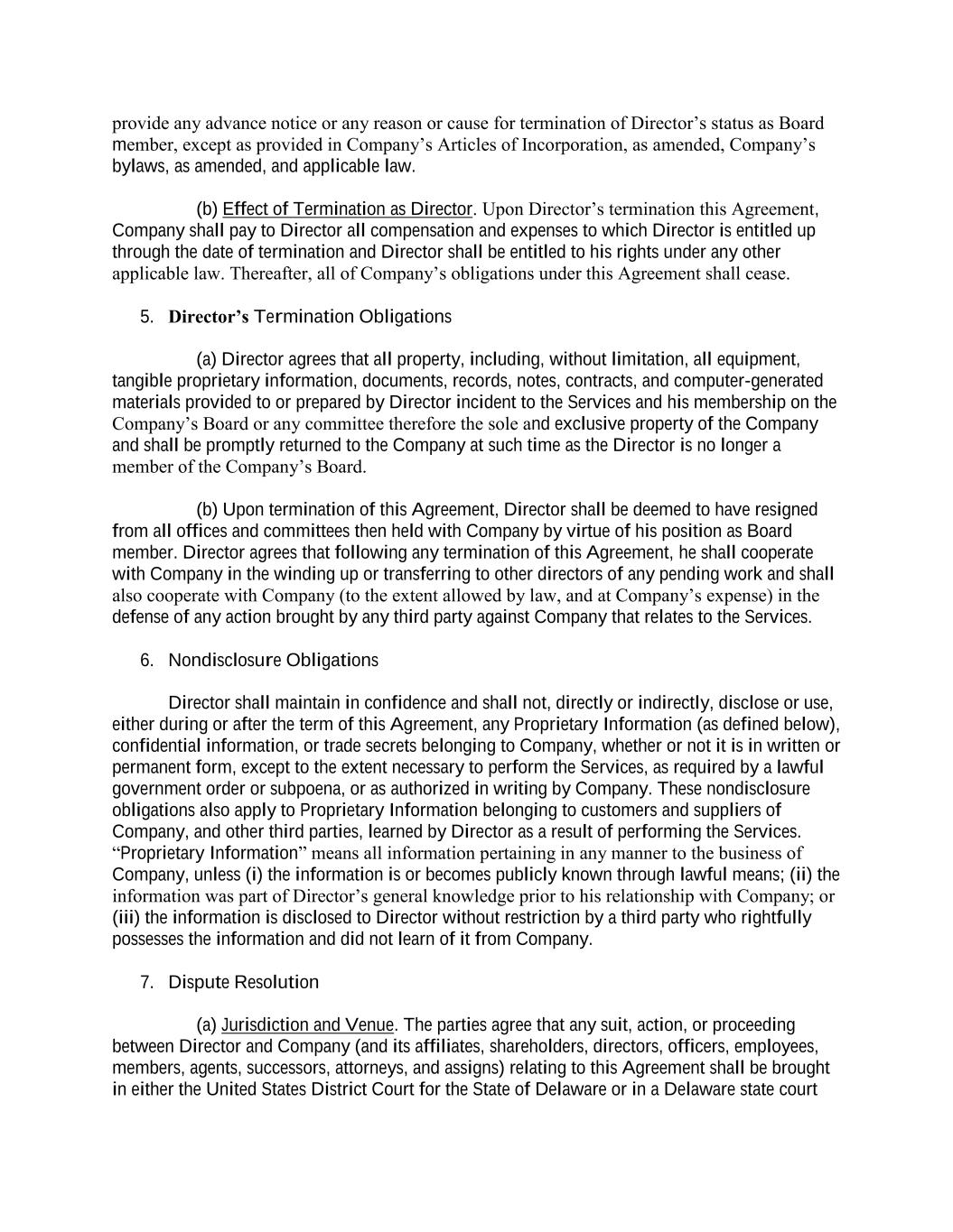 provide any advance notice or any reason or cause for termination of Director’s status as Board member, except as provided in Company’s Articles of Incorporation, as amended, Company’s bylaws, as amended, and applicable law. (b) Effect of Termination as Director. Upon Director’s termination this Agreement, Company shall pay to Director all compensation and expenses to which Director is entitled up through the date of termination and Director shall be entitled to his rights under any other applicable law. Thereafter, all of Company’s obligations under this Agreement shall cease. 5. Director’s Termination Obligations (a) Director agrees that all property, including, without limitation, all equipment, tangible proprietary information, documents, records, notes, contracts, and computer-generated materials provided to or prepared by Director incident to the Services and his membership on the Company’s Board or any committee therefore the sole and exclusive property of the Company and shall be promptly returned to the Company at such time as the Director is no longer a member of the Company’s Board. (b) Upon termination of this Agreement, Director shall be deemed to have resigned from all offices and committees then held with Company by virtue of his position as Board member. Director agrees that following any termination of this Agreement, he shall cooperate with Company in the winding up or transferring to other directors of any pending work and shall also cooperate with Company (to the extent allowed by law, and at Company’s expense) in the defense of any action brought by any third party against Company that relates to the Services. 6. Nondisclosure Obligations Director shall maintain in confidence and shall not, directly or indirectly, disclose or use, either during or after the term of this Agreement, any Proprietary Information (as defined below), confidential information, or trade secrets belonging to Company, whether or not it is in written or permanent form, except to the extent necessary to perform the Services, as required by a lawful government order or subpoena, or as authorized in writing by Company. These nondisclosure obligations also apply to Proprietary Information belonging to customers and suppliers of Company, and other third parties, learned by Director as a result of performing the Services. “Proprietary Information” means all information pertaining in any manner to the business of Company, unless (i) the information is or becomes publicly known through lawful means; (ii) the information was part of Director’s general knowledge prior to his relationship with Company; or (iii) the information is disclosed to Director without restriction by a third party who rightfully possesses the information and did not learn of it from Company. 7. Dispute Resolution (a) Jurisdiction and Venue. The parties agree that any suit, action, or proceeding between Director and Company (and its affiliates, shareholders, directors, officers, employees, members, agents, successors, attorneys, and assigns) relating to this Agreement shall be brought in either the United States District Court for the State of Delaware or in a Delaware state court DocuSign Envelope ID: 5355FCC4-8252-4ABF-9403-FEC94E16B3E9