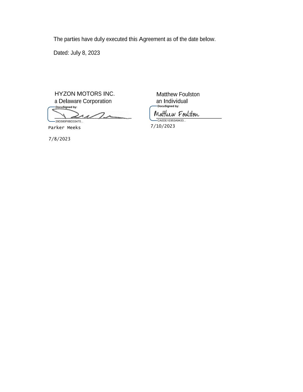 The parties have duly executed this Agreement as of the date below. Dated: July 8, 2023 HYZON MOTORS INC. Matthew Foulston a Delaware Corporation an Individual DocuSign Envelope ID: 5355FCC4-8252-4ABF-9403-FEC94E16B3E9 7/10/2023Parker Meeks 7/8/2023