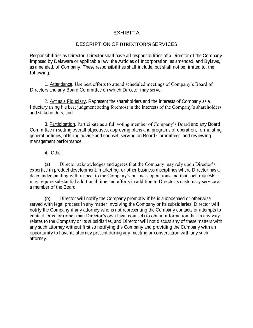 EXHIBIT A DESCRIPTION OF DIRECTOR’S SERVICES Responsibilities as Director. Director shall have all responsibilities of a Director of the Company imposed by Delaware or applicable law, the Articles of Incorporation, as amended, and Bylaws, as amended, of Company. These responsibilities shall include, but shall not be limited to, the following: 1. Attendance. Use best efforts to attend scheduled meetings of Company’s Board of Directors and any Board Committee on which Director may serve; 2. Act as a Fiduciary. Represent the shareholders and the interests of Company as a fiduciary using his best judgment acting foremost in the interests of the Company’s shareholders and stakeholders; and 3. Participation. Participate as a full voting member of Company’s Board and any Board Committee in setting overall objectives, approving plans and programs of operation, formulating general policies, offering advice and counsel, serving on Board Committees, and reviewing management performance. 4. Other. (a) Director acknowledges and agrees that the Company may rely upon Director’s expertise in product development, marketing, or other business disciplines where Director has a deep understanding with respect to the Company’s business operations and that such requests may require substantial additional time and efforts in addition to Director’s customary service as a member of the Board. (b) Director will notify the Company promptly if he is subpoenaed or otherwise served with legal process in any matter involving the Company or its subsidiaries. Director will notify the Company if any attorney who is not representing the Company contacts or attempts to contact Director (other than Director’s own legal counsel) to obtain information that in any way relates to the Company or its subsidiaries, and Director will not discuss any of these matters with any such attorney without first so notifying the Company and providing the Company with an opportunity to have its attorney present during any meeting or conversation with any such attorney. DocuSign Envelope ID: 5355FCC4-8252-4ABF-9403-FEC94E16B3E9