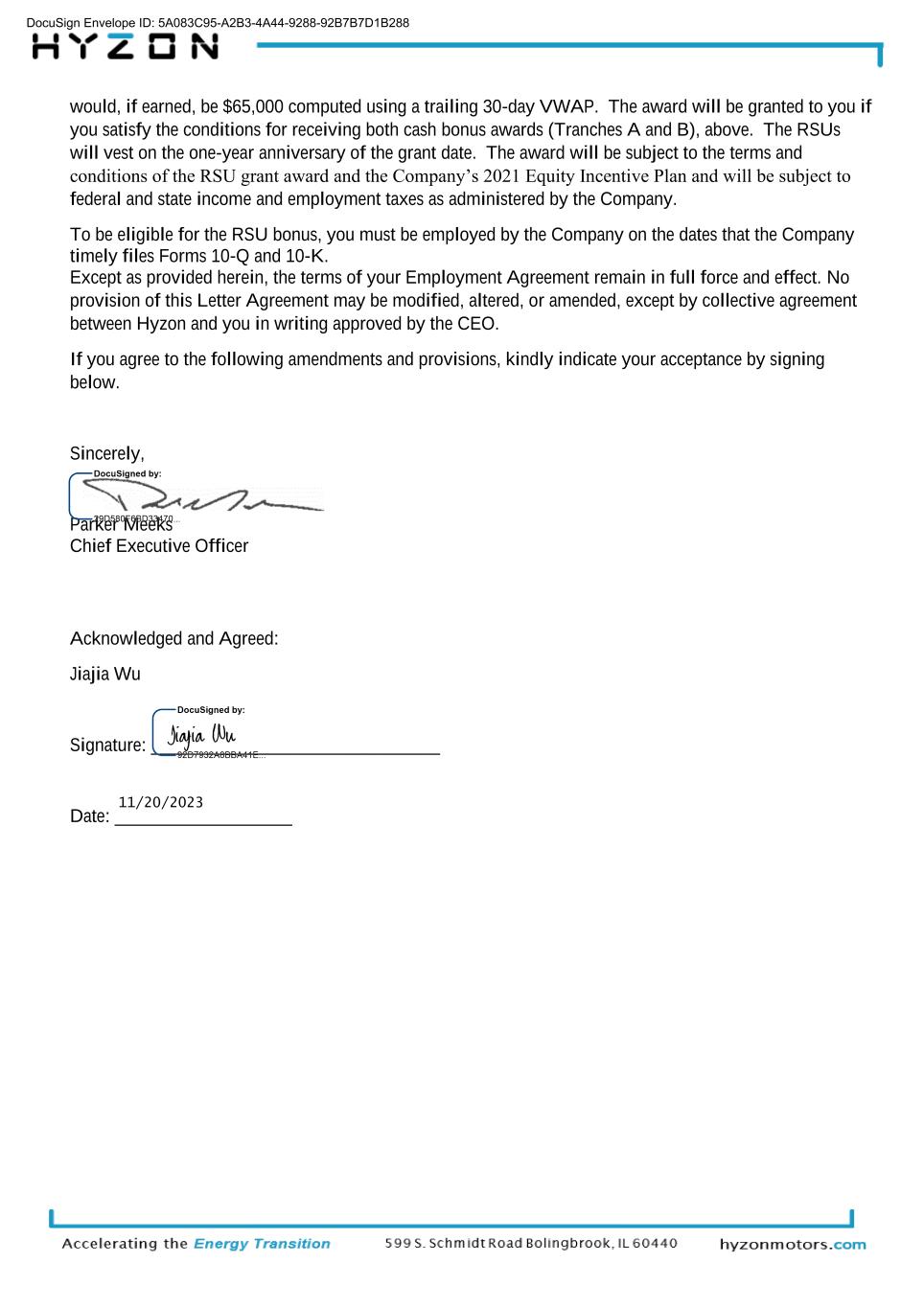 would, if earned, be $65,000 computed using a trailing 30-day VWAP. The award will be granted to you if you satisfy the conditions for receiving both cash bonus awards (Tranches A and B), above. The RSUs will vest on the one-year anniversary of the grant date. The award will be subject to the terms and conditions of the RSU grant award and the Company’s 2021 Equity Incentive Plan and will be subject to federal and state income and employment taxes as administered by the Company. To be eligible for the RSU bonus, you must be employed by the Company on the dates that the Company timely files Forms 10-Q and 10-K. Except as provided herein, the terms of your Employment Agreement remain in full force and effect. No provision of this Letter Agreement may be modified, altered, or amended, except by collective agreement between Hyzon and you in writing approved by the CEO. If you agree to the following amendments and provisions, kindly indicate your acceptance by signing below. Sincerely, Parker Meeks Chief Executive Officer Acknowledged and Agreed: Jiajia Wu Signature: _______________________________ Date: ___________________ DocuSign Envelope ID: 5A083C95-A2B3-4A44-9288-92B7B7D1B288 11/20/2023