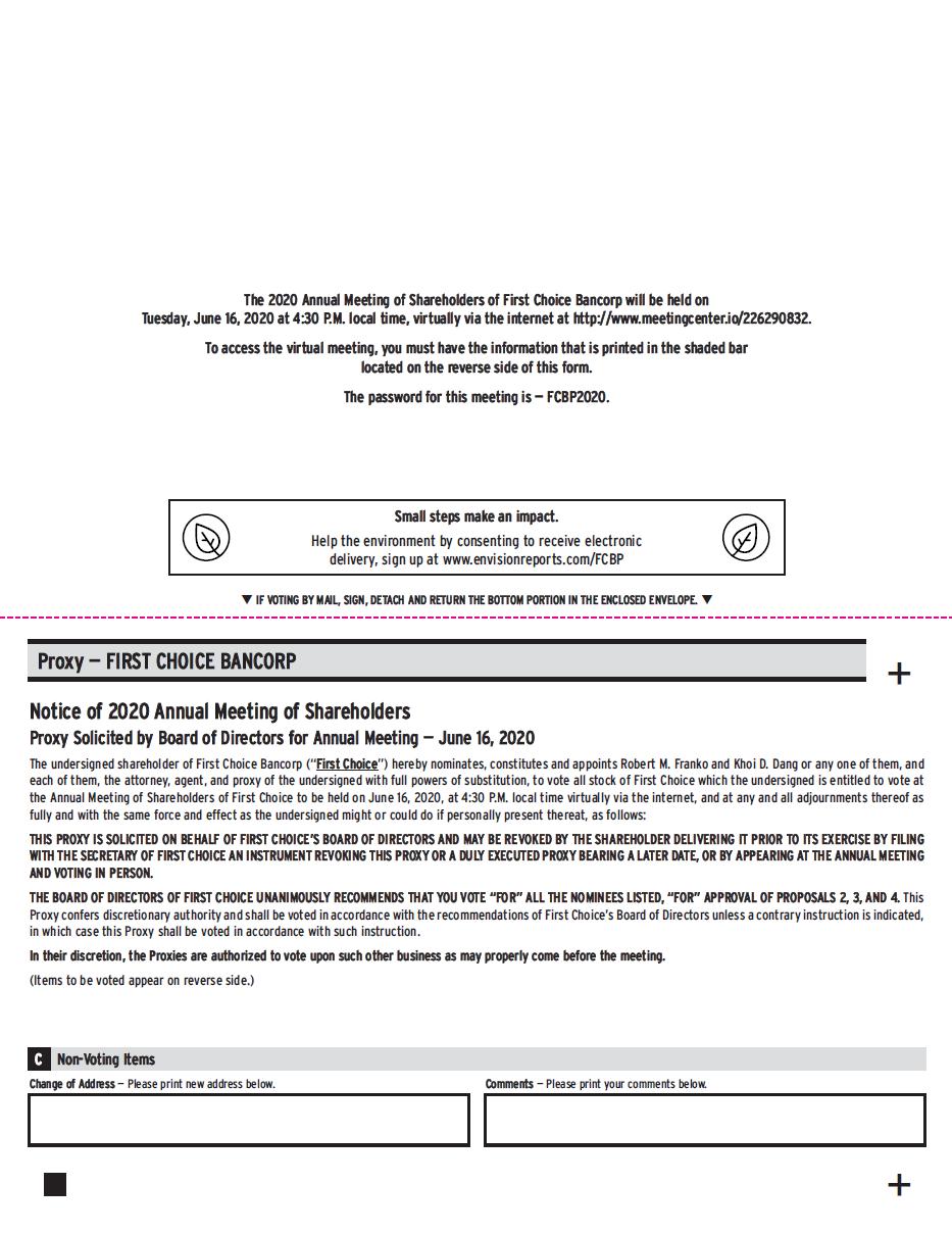 YOU SHOULD HAVE RECEIVED IN THE MAIL A PRELIMINARY NOTICE OF FIRST CHOICE BANCORP’S 2020 ANNUAL SHAREHOLDERS MEETING, WHICH INCLUDES A DESCRIPTION OF THE VARIOUS VOTING PROCEDURES AVAILABLE TO YOU, INCLUDING VOTING VIA THE INTERNET. YOU ARE REQUESTED TO VOTE VIA THE INTERNET AT WWW.ENVISIONREPORTS.COM/FCBP OR WWW.EDOCUMENTVIEW.COM/FCBP WITHOUT DELAY WHETHER OR NOT YOU PLAN TO ATTEND THE VIRTUAL MEETING. IF YOU VOTE VIA THE INTERNET, YOUR VOTE WILL ALSO BE CONSIDERED AS YOUR CONSENT TO VOTE ELECTRONICALLY AS PROVIDED IN SECTIONS 20, 21, 600 AND 601 OF THE CALIFORNIA GENERAL CORPORATIONS LAW, AS AUTHORIZED BY THE COMPANY’S BYLAWS. YOU MAY REVOKE YOUR PROXY AT ANY TIME PRIOR TO IT BEING VOTED, EITHER BY ATTENDING THE VIRTUAL MEETING AND ELECTING TO VOTE, OR BY FILING WITH THE SECRETARY OF FIRST CHOICE BANCORP, PRIOR TO THE VIRTUAL MEETING, A WRITTEN NOTICE OF REVOCATION OR A DULY EXECUTED PROXY BEARING A LATER DATE.