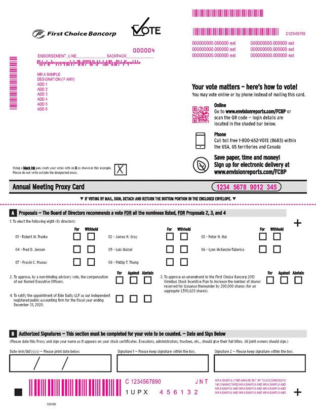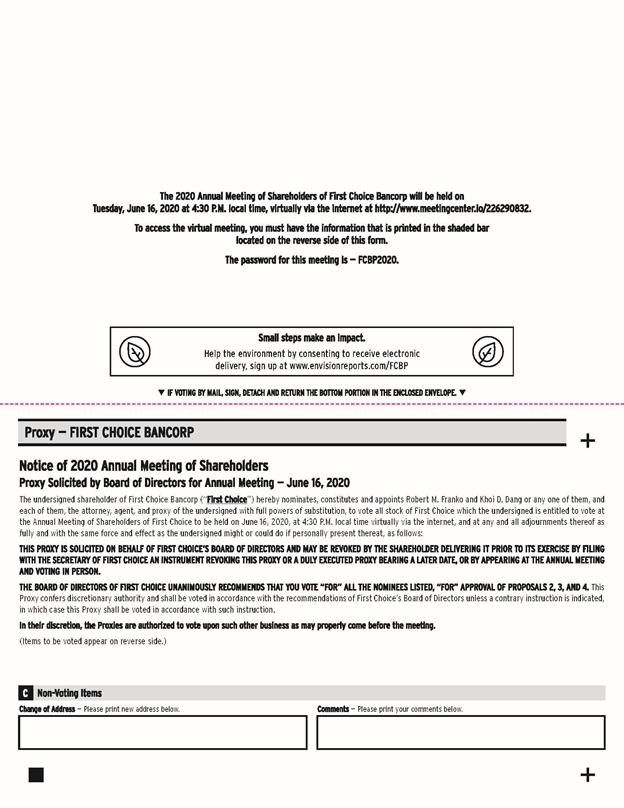 YOU SHOULD HAVE RECEIVED IN THE MAIL A PRELIMINARY NOTICE OF FIRST CHOICE BANCORP’S 2020 ANNUAL SHAREHOLDERS MEETING, WHICH INCLUDES A DESCRIPTION OF THE VARIOUS VOTING PROCEDURES AVAILABLE TO YOU, INCLUDING VOTING VIA THE INTERNET. YOU ARE REQUESTED TO VOTE VIA THE INTERNET AT WWW.ENVISIONREPORTS.COM/FCBP OR WWW.EDOCUMENTVIEW.COM/FCBP WITHOUT DELAY WHETHER OR NOT YOU PLAN TO ATTEND THE VIRTUAL MEETING. IF YOU VOTE VIA THE INTERNET, YOUR VOTE WILL ALSO BE CONSIDERED AS YOUR CONSENT TO VOTE ELECTRONICALLY AS PROVIDED IN SECTIONS 20, 21, 600 AND 601 OF THE CALIFORNIA GENERAL CORPORATIONS LAW, AS AUTHORIZED BY THE COMPANY’S BYLAWS. YOU MAY REVOKE YOUR PROXY AT ANY TIME PRIOR TO IT BEING VOTED, EITHER BY ATTENDING THE VIRTUAL MEETING AND ELECTING TO VOTE, OR BY FILING WITH THE SECRETARY OF FIRST CHOICE BANCORP, PRIOR TO THE VIRTUAL MEETING, A WRITTEN NOTICE OF REVOCATION OR A DULY EXECUTED PROXY BEARING A LATER DATE.