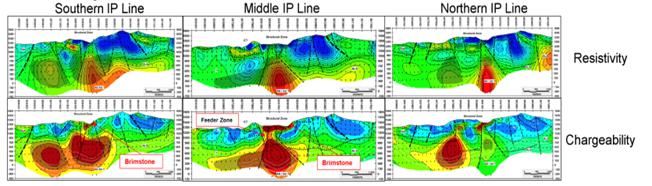 Figure 2: Three IP Lines pictured in Figure 1 showing Brimstone geophysics and modeled structure based on mapping and drilling.