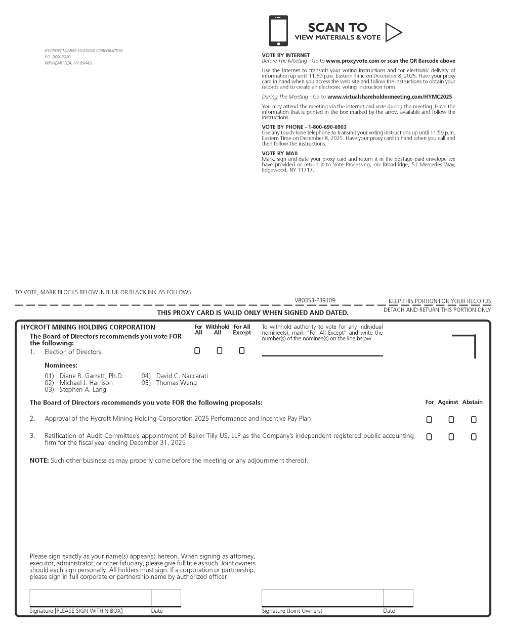| 3. | Ratify the Audit Committee’s appointment of Baker Tilly US, LLP (“Baker Tilly”) to serve as Hycroft’s independent registered public accounting firm for the year ending December 31, 2025; and | |