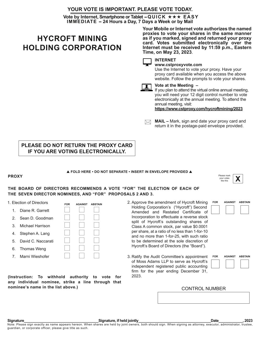 HYCROFT MINING HOLDING CORPORATION PLEASE DO NOT RETURN THE PROXY CARD IF YOU ARE VOTING ELECTRONICALLY. FOLD HERE • DO NOT SEPARATE • INSERT IN ENVELOPE PROVIDED 1. Election of Directors 2. Approve the amendment of Hycroft Mining Holding Corporation’s (“Hycroft”) Second Amended and Restated Certificate of Incorporation to effectuate a reverse stock split of Hycroft’s outstanding shares of Class A common stock, par value $0.0001 per share, at a ratio of no less than 1-for-10 and no more than 1-for-25, with such ratio to be determined at the sole discretion of Hycroft’s Board of Directors (the “Board”). 3. Ratify the Audit Committee’s appointment of Moss Adams LLP to serve as Hycroft’s independent registered public accounting firm for the year ending December 31, 2023. Signature_____________________________________Signature, if held jointly____________________________________Date____________, 2023 Note: Please sign exactly as name appears hereon. When shares are held by joint owners, both should sign. When signing as attorney, executor, administrator, trustee, guardian, or corporate officer, please give title as such. Please mark your votes like this X FOR AGAINST ABSTAIN FOR AGAINST ABSTAIN FOR AGAINST ABSTAIN INTERNET www.cstproxyvote.com Use the Internet to vote your proxy. Have your proxy card available when you access the above website. Follow the prompts to vote your shares. Vote at the Meeting – If you plan to attend the virtual online annual meeting, you will need your 12 digit control number to vote electronically at the annual meeting. To attend the annual meeting, visit: https://www.cstproxy.com/hycroftmining/2023 MAIL – Mark, sign and date your proxy card and return it in the postage-paid envelope provided. Your Mobile or Internet vote authorizes the named proxies to vote your shares in the same manner as if you marked, signed and returned your proxy card. Votes submitted electronically over the Internet must be received by 11:59 p.m., Eastern Time, on May 23, 2023. YOUR VOTE IS IMPORTANT. PLEASE VOTE TODAY. IMMEDIATE - 24 Hours a Day, 7 Days a Week or by Mail Vote by Internet, Smartphone or Tablet - Q U I C K E A S Y PROXY THE BOARD OF DIRECTORS RECOMMENDS A VOTE “FOR” THE ELECTION OF EACH OF THE SEVEN DIRECTOR NOMINEES, AND “FOR” PROPOSALS 2 AND 3. 22087 Hycroft Proxy Card Rev3 Front CONTROL NUMBER 1. Diane R. Garrett 2. Sean D. Goodman 3. Michael Harrison 4. Stephen A. Lang 5. David C. Naccarati 6. Thomas Weng 7. Marni Wieshofer (Instruction: To withhold authority to vote for any individual nominee, strike a line through that nominee’s name in the list above.)
