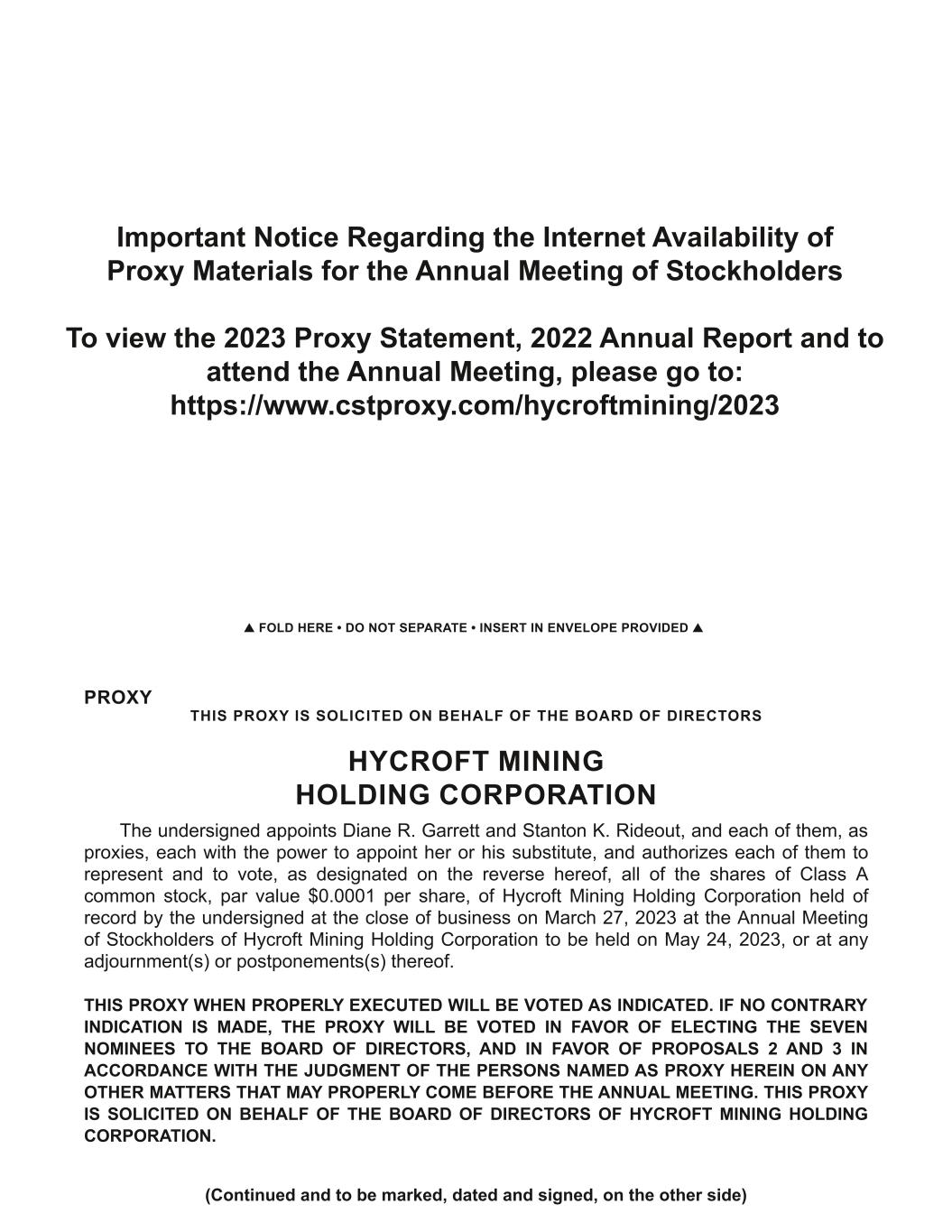 FOLD HERE • DO NOT SEPARATE • INSERT IN ENVELOPE PROVIDED HYCROFT MINING HOLDING CORPORATION PROXY THIS PROXY IS SOLICITED ON BEHALF OF THE BOARD OF DIRECTORS The undersigned appoints Diane R. Garrett and Stanton K. Rideout, and each of them, as proxies, each with the power to appoint her or his substitute, and authorizes each of them to represent and to vote, as designated on the reverse hereof, all of the shares of Class A common stock, par value $0.0001 per share, of Hycroft Mining Holding Corporation held of record by the undersigned at the close of business on March 27, 2023 at the Annual Meeting of Stockholders of Hycroft Mining Holding Corporation to be held on May 24, 2023, or at any adjournment(s) or postponements(s) thereof. THIS PROXY WHEN PROPERLY EXECUTED WILL BE VOTED AS INDICATED. IF NO CONTRARY INDICATION IS MADE, THE PROXY WILL BE VOTED IN FAVOR OF ELECTING THE SEVEN NOMINEES TO THE BOARD OF DIRECTORS, AND IN FAVOR OF PROPOSALS 2 AND 3 IN ACCORDANCE WITH THE JUDGMENT OF THE PERSONS NAMED AS PROXY HEREIN ON ANY OTHER MATTERS THAT MAY PROPERLY COME BEFORE THE ANNUAL MEETING. THIS PROXY IS SOLICITED ON BEHALF OF THE BOARD OF DIRECTORS OF HYCROFT MINING HOLDING CORPORATION. (Continued and to be marked, dated and signed, on the other side) 22087 Hycroft Proxy Card Rev2 Back Important Notice Regarding the Internet Availability of Proxy Materials for the Annual Meeting of Stockholders To view the 2023 Proxy Statement, 2022 Annual Report and to attend the Annual Meeting, please go to: https://www.cstproxy.com/hycroftmining/2023