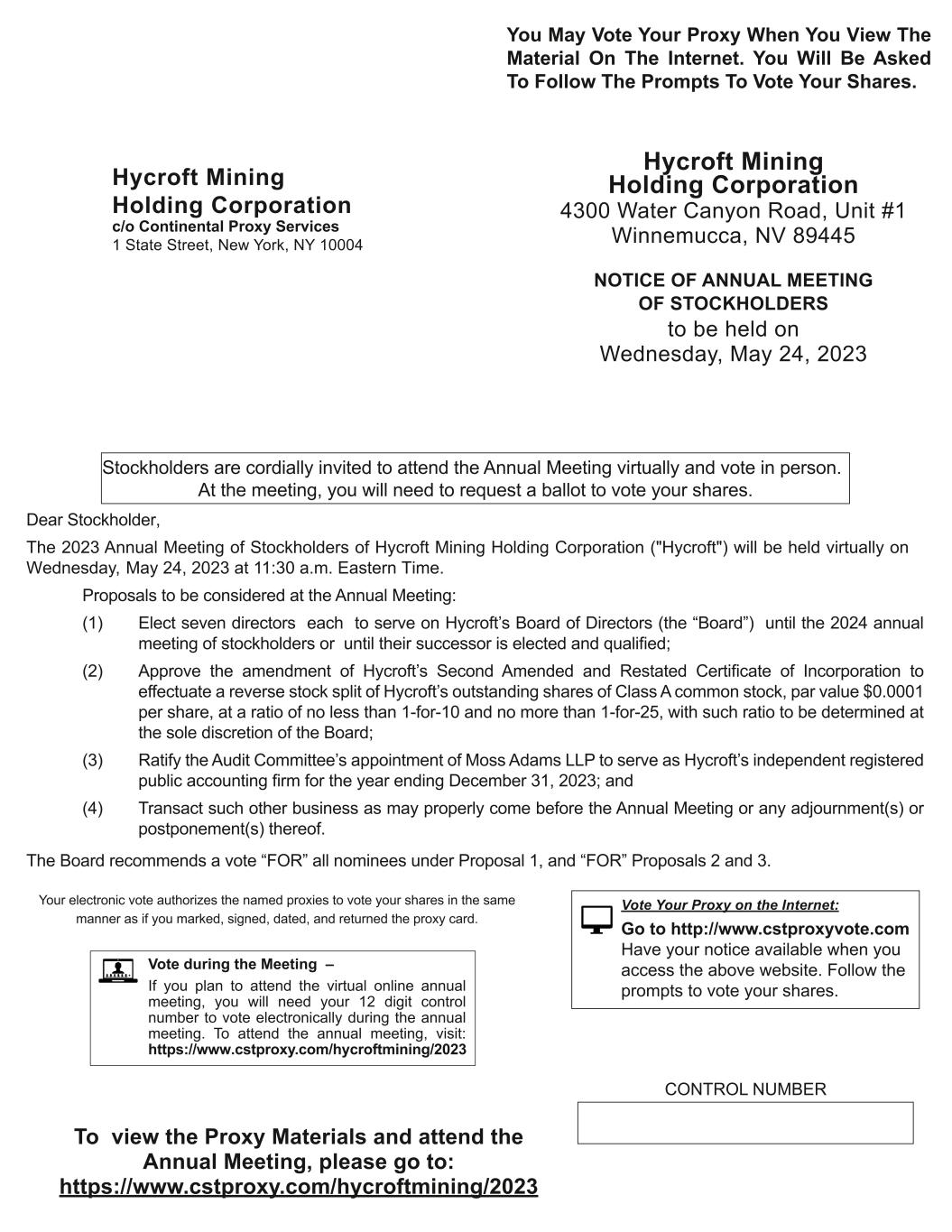 You May Vote Your Proxy When You View The Material On The Internet. You Will Be Asked To Follow The Prompts To Vote Your Shares. Hycroft Mining Holding Corporation 4300 Water Canyon Road, Unit #1 Winnemucca, NV 89445 NOTICE OF ANNUAL MEETING OF STOCKHOLDERS to be held on Wednesday, May 24, 2023 Stockholders are cordially invited to attend the Annual Meeting virtually and vote in person. At the meeting, you will need to request a ballot to vote your shares. Dear Stockholder, The 2023 Annual Meeting of Stockholders of Hycroft Mining Holding Corporation ("Hycroft") will be held virtually on Wednesday, May 24, 2023 at 11:30 a.m. Eastern Time. Proposals to be considered at the Annual Meeting: (1) Elect seven directors each to serve on Hycroft’s Board of Directors (the “Board”) until the 2024 annual meeting of stockholders or until their successor is elected and qualified; (2) Approve the amendment of Hycroft’s Second Amended and Restated Certificate of Incorporation to effectuate a reverse stock split of Hycroft’s outstanding shares of Class A common stock, par value $0.0001 per share, at a ratio of no less than 1-for-10 and no more than 1-for-25, with such ratio to be determined at the sole discretion of the Board; (3) Ratify the Audit Committee’s appointment of Moss Adams LLP to serve as Hycroft’s independent registered public accounting firm for the year ending December 31, 2023; and (4) Transact such other business as may properly come before the Annual Meeting or any adjournment(s) or postponement(s) thereof. The Board recommends a vote “FOR” all nominees under Proposal 1, and “FOR” Proposals 2 and 3. Your electronic vote authorizes the named proxies to vote your shares in the same manner as if you marked, signed, dated, and returned the proxy card. Vote Your Proxy on the Internet: Go to http://www.cstproxyvote.com Have your notice available when you access the above website. Follow the prompts to vote your shares. To view the Proxy Materials and attend the Annual Meeting, please go to: https://www.cstproxy.com/hycroftmining/2023 CONTROL NUMBER Hycroft Mining Holding Corporation c/o Continental Proxy Services 1 State Street, New York, NY 10004 22087 Hycroft Mining Holding Corp Proxy Notice Rev3 Front Vote during the Meeting – If you plan to attend the virtual online annual meeting, you will need your 12 digit control number to vote electronically during the annual meeting. To attend the annual meeting, visit: https://www.cstproxy.com/hycroftmining/2023