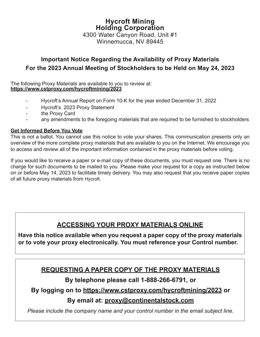Hycroft Mining Holding Corporation 4300 Water Canyon Road, Unit #1 Winnemucca, NV 89445 Important Notice Regarding the Availability of Proxy Materials For the 2023 Annual Meeting of Stockholders to be Held on May 24, 2023 The following Proxy Materials are available to you to review at: https://www.cstproxy.com/hycroftmining/2023 - Hycroft’s Annual Report on Form 10-K for the year ended December 31, 2022 - Hycroft’s 2023 Proxy Statement - the Proxy Card - any amendments to the foregoing materials that are required to be furnished to stockholders Get Informed Before You Vote This is not a ballot. You cannot use this notice to vote your shares. This communication presents only an overview of the more complete proxy materials that are available to you on the Internet. We encourage you to access and review all of the important information contained in the proxy materials before voting. If you would like to receive a paper or e-mail copy of these documents, you must request one. There is no charge for such documents to be mailed to you. Please make your request for a copy as instructed below on or before May 14, 2023 to facilitate timely delivery. You may also request that you receive paper copies of all future proxy materials from Hycroft. ACCESSING YOUR PROXY MATERIALS ONLINE Have this notice available when you request a paper copy of the proxy materials or to vote your proxy electronically. You must reference your Control number. REQUESTING A PAPER COPY OF THE PROXY MATERIALS By telephone please call 1-888-266-6791, or By logging on to https://www.cstproxy.com/hycroftmining/2023 or By email at: proxy@continentalstock.com Please include the company name and your control number in the email subject line. 22087 Hycroft Mining Holding Corp Proxy Notice Rev3 Back