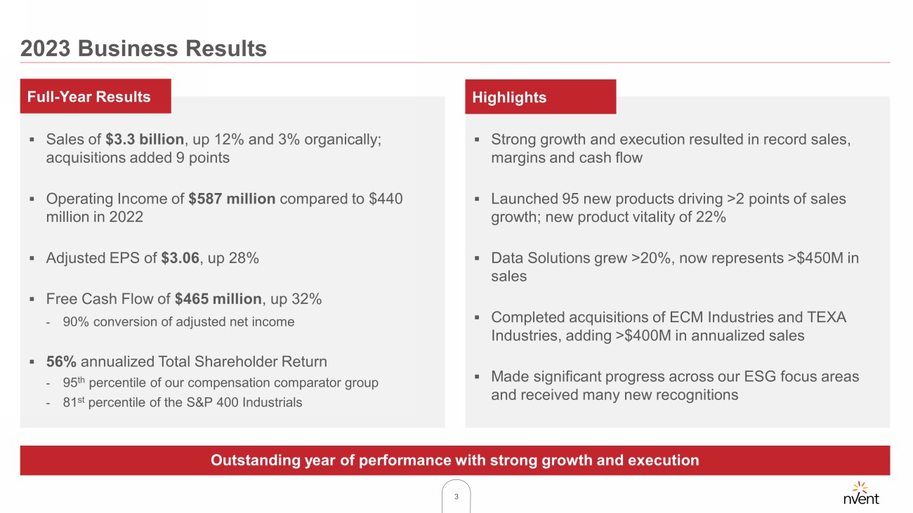 2 CAUTION CONCERNING FORWARD - LOOKING STATEMENTS This presentation contains statements that we believe to be “forward - looking statements” within the meaning of the Private Secur ities Litigation Reform Act of 1995. All statements, other than statements of historical fact are forward looking statements. Without limitation, any statements preceded or followed by or that include the words “targets,” “plans,” “believes,” “expects,” “intends,” “will,” “likely,” “may,” “anticipates,” “estimates,” “projects,” “forecasts,” “should,” “would,” "could ," “positioned,” “strategy,” “future,” “are confident,” or words, phrases or terms of similar substance or the negative thereof, are forward - looking statements. All projections in this presentation are als o forward - looking statements. These forward - looking statements are not guarantees of future performance and are subject to risks, uncertainties, assumptions and other factors, s ome of which are beyond our control, which could cause actual results to differ materially from those expressed or implied by such forward - looking statements. These factors include ad verse effects on our business operations or financial results, including due to the overall global economic and business conditions impacting our business; the ability to achieve the benef its of our restructuring plans; the ability to successfully identify, finance, complete and integrate acquisitions, including the ECM Industries and other recent acquisitions; competition and pri cin g pressures in the markets we serve, including the impacts of tariffs; volatility in currency exchange rates, interest rates and commodity prices; inability to generate savings from ex cel lence in operations initiatives consisting of lean enterprise, supply management and cash flow practices; inability to mitigate material and other cost inflation; risks related to the avai lab ility of, and cost inflation in, supply chain inputs, including labor, raw materials, commodities, packaging and transportation; increased risks associated with operating foreign businesses , i ncluding risks associated with military conflicts, such as that between Russia and Ukraine, and related sanctions; the ability to deliver backlog and win future project work; failure o f m arkets to accept new product introductions and enhancements; the impact of changes in laws and regulations, including those that limit U.S. tax benefits; the outcome of lit iga tion and governmental proceedings; and the ability to achieve our long - term strategic operating and ESG goals. Additional information concerning these and other factors is contained in our filings with the U.S. Securities and Exchange Commission, including our Annual Report on Form 10 - K and our Quarterly Reports on Form 10 - Q. All forward - looking statements spea k only as of the date of this presentation. nVent assumes no obligation, and disclaims any obligation, to update the information contained in this presentation. K EY D EFINITIONS AND N OTES Except as otherwise noted all references to 2023 and 2022 represent our results for the period indicated, presented on an adj ust ed basis. “Organic Sales" refers to GAAP revenue excluding (1) the impact of currency translation and (2) the impact of revenue from acquired businesses recorded prior to the fi rst anniversary of the acquisition less the amount of sales attributable to divested product lines not considered discontinued operations. “Segment Income” represents Operating Income e xcl usive of non - cash intangible amortization, certain acquisition related costs, costs of restructuring activities, impairments and other unusual non - operating items. Return on Sales ("ROS") equals Segment Income divided by Sales. Forward - Looking Statements
