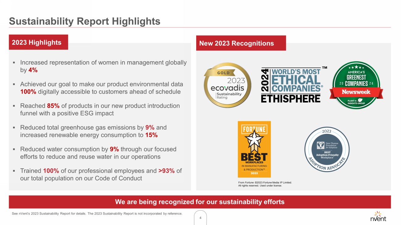 3 Outstanding year of performance with strong growth and execution 2023 Business Results ▪ Sales of $3.3 billion , up 12% and 3% organically; acquisitions added 9 points ▪ Operating Income of $587 million compared to $440 million in 2022 ▪ Adjusted EPS of $3.06 , up 28% ▪ Free Cash Flow of $465 million , up 32% - 90% conversion of adjusted net income ▪ 56% annualized Total Shareholder Return - 95 th percentile of our compensation comparator group - 81 st percentile of the S&P 400 Industrials ▪ Strong growth and execution resulted in record sales, margins and cash flow ▪ Launched 95 new products driving >2 points of sales growth; new product vitality of 22% ▪ Data Solutions grew >20%, now represents >$450M in sales ▪ Completed acquisitions of ECM Industries and TEXA Industries, adding >$400M in annualized sales ▪ Made significant progress across our ESG focus areas and received many new recognitions Full - Year Results Highlights