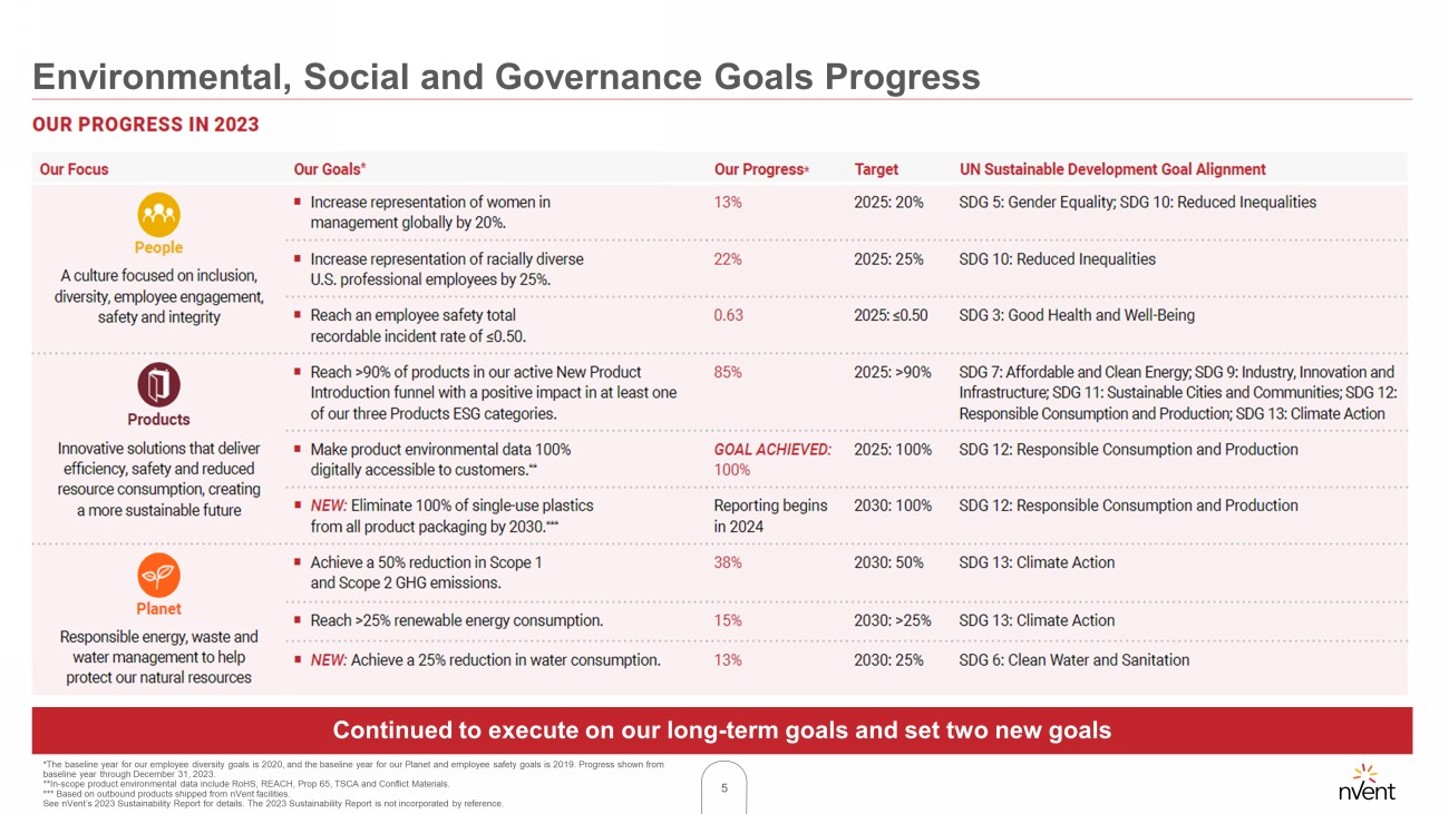 4 We are being recognized for our sustainability efforts Sustainability Report Highlights New 2023 Recognitions ▪ Increased representation of women in management globally by 4% ▪ Achieved our goal to make our product environmental data 100% digitally accessible to customers ahead of schedule ▪ Reached 85% of products in our new product introduction funnel with a positive ESG impact ▪ Reduced total greenhouse gas emissions by 9% and increased renewable energy consumption to 15% ▪ Reduced water consumption by 9% through our focused efforts to reduce and reuse water in our operations ▪ Trained 100% of our professional employees and >93% of our total population on our Code of Conduct 2023 Highlights S ee nVent’s 2023 Sustainability Report for details. The 2023 Sustainability Report is not incorporated by reference. From Fortune . ©2023 Fortune Media IP Limited. All rights reserved. Used under license.
