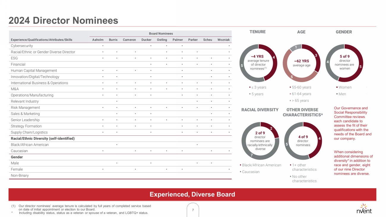 6 We value investor feedback and will continue to seek it through engagement initiatives *nVent outstanding shares and shareholder ownership are as of the time of fall outreach, which reflects June 30, 2023 data. Shareholder ownership is based on publicly disclosed ownership. Shareholder Engagement ▪ During our 2023 engagement process, members of the Board and management met with shareholders representing 26% of outstanding shares * on a range of topics, including: - ESG, including Scope 1, 2 and 3 emissions and our materiality assessment process - Board oversight of risk - Board composition and diversity - Business ethics - Inclusion and diversity - Human capital management - Shareholder engagement - Executive compensation