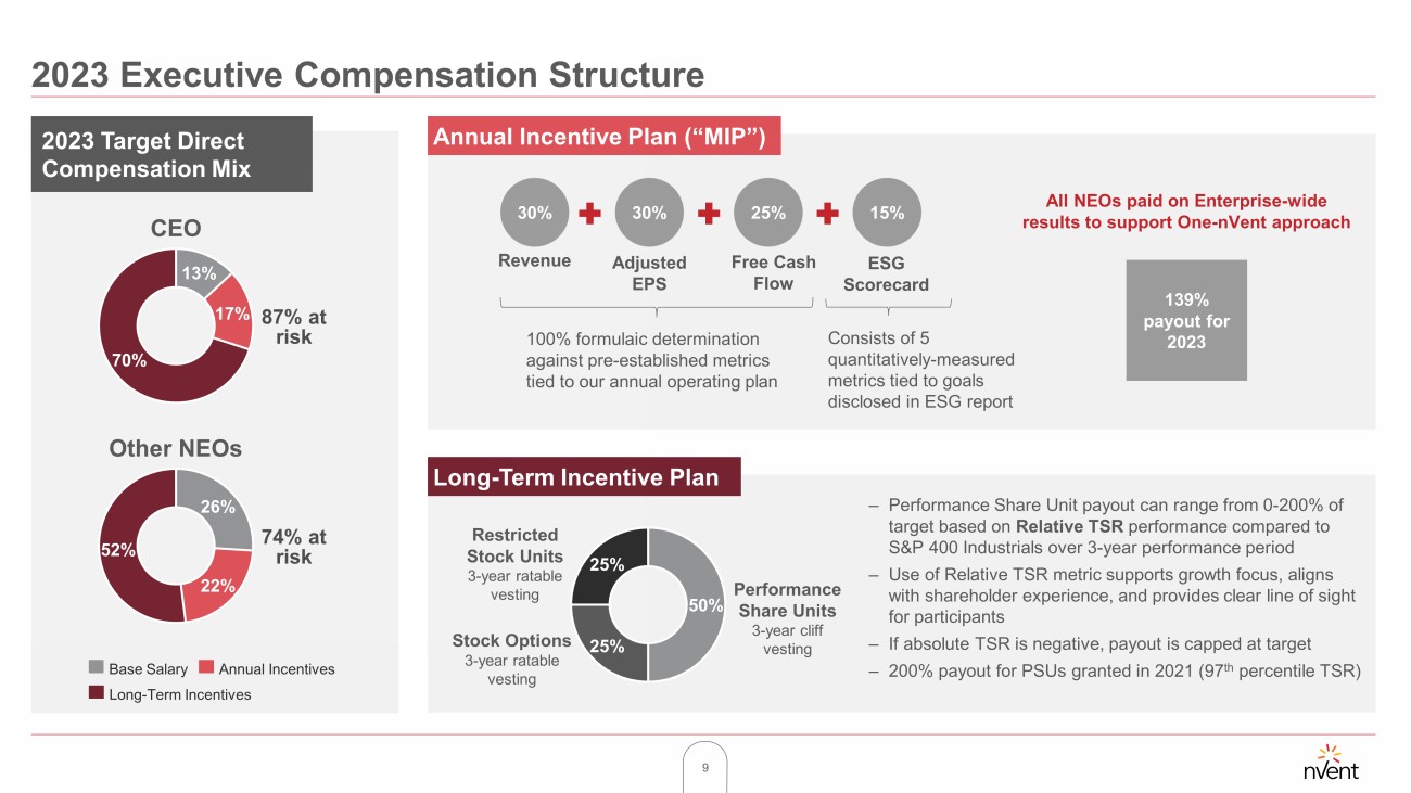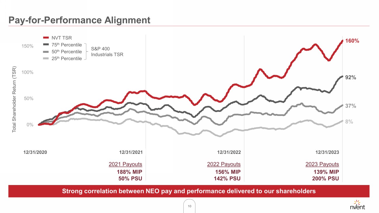9 2023 Executive Compensation Structure 2023 Target Direct Compensation Mix 13% 17% 70% 26% 22% 52% CEO Other NEOs Base Salary Annual Incentives Long - Term Incentives 87 % at risk 74% at risk Annual Incentive Plan (“MIP”) Long - Term Incentive Plan 30% 30% 25% Revenue Adjusted EPS Free Cash Flow 15% ESG Scorecard 100% formulaic determination against pre - established metrics tied to our annual operating plan Consists of 5 quantitatively - measured metrics tied to goals disclosed in ESG report All NEOs paid on Enterprise - wide results to support One - nVent approach 50% 25% 25% – Performance Share Unit payout can range from 0 - 200% of target based on Relative TSR performance compared to S&P 400 Industrials over 3 - year performance period – Use of Relative TSR metric supports growth focus, aligns with shareholder experience, and provides clear line of sight for participants – If absolute TSR is negative, payout is capped at target – 200% payout for PSUs granted in 2021 (97 th percentile TSR) Restricted Stock Units 3 - year ratable vesting Stock Options 3 - year ratable vesting Performance Share Units 3 - year cliff vesting 139% payout for 2023