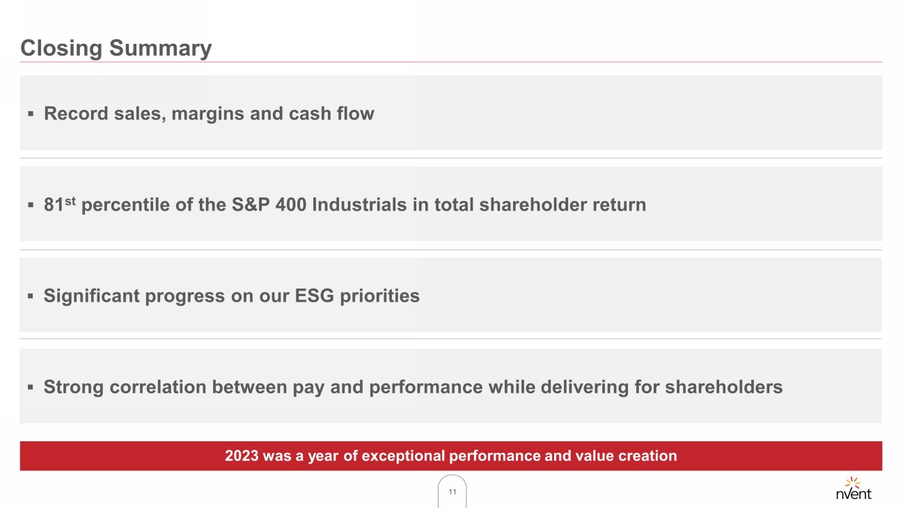 10 -50% 0% 50% 100% 150% Strong correlation between NEO pay and performance delivered to our shareholders Pay - for - Performance Alignment 2021 Payouts 188% MIP 50% PSU 2022 Payouts 156% MIP 142% PSU 2023 Payouts 139% MIP 200% PSU NVT TSR 75 th Percentile 50 th Percentile 25 th Percentile S&P 400 Industrials TSR 12/31/2021 12/31/2022 12/31/2023 12/31/2020 160% 92% 37% 8% Total Shareholder Return (TSR)