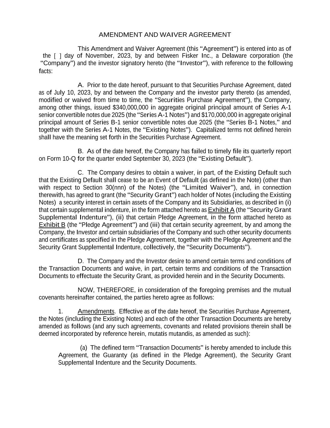 AMENDMENT AND WAIVER AGREEMENT This Amendment and Waiver Agreement (this “Agreement”) is entered into as of the [ ] day of November, 2023, by and between Fisker Inc., a Delaware corporation (the “Company”) and the investor signatory hereto (the “Investor”), with reference to the following facts: A. Prior to the date hereof, pursuant to that Securities Purchase Agreement, dated as of July 10, 2023, by and between the Company and the investor party thereto (as amended, modified or waived from time to time, the “Securities Purchase Agreement”), the Company, among other things, issued $340,000,000 in aggregate original principal amount of Series A-1 senior convertible notes due 2025 (the “Series A-1 Notes”) and $170,000,000 in aggregate original principal amount of Series B-1 senior convertible notes due 2025 (the “Series B-1 Notes,” and together with the Series A-1 Notes, the “Existing Notes”). Capitalized terms not defined herein shall have the meaning set forth in the Securities Purchase Agreement. B. As of the date hereof, the Company has failed to timely file its quarterly report on Form 10-Q for the quarter ended September 30, 2023 (the “Existing Default”). C. The Company desires to obtain a waiver, in part, of the Existing Default such that the Existing Default shall cease to be an Event of Default (as defined in the Note) (other than with respect to Section 30(nnn) of the Notes) (the “Limited Waiver”), and, in connection therewith, has agreed to grant (the “Security Grant”) each holder of Notes (including the Existing Notes) a security interest in certain assets of the Company and its Subsidiaries, as described in (i) that certain supplemental indenture, in the form attached hereto as Exhibit A (the “Security Grant Supplemental Indenture”), (ii) that certain Pledge Agreement, in the form attached hereto as Exhibit B (the “Pledge Agreement”) and (iii) that certain security agreement, by and among the Company, the Investor and certain subsidiaries of the Company and such other security documents and certificates as specified in the Pledge Agreement, together with the Pledge Agreement and the Security Grant Supplemental Indenture, collectively, the “Security Documents”). D. The Company and the Investor desire to amend certain terms and conditions of the Transaction Documents and waive, in part, certain terms and conditions of the Transaction Documents to effectuate the Security Grant, as provided herein and in the Security Documents. NOW, THEREFORE, in consideration of the foregoing premises and the mutual covenants hereinafter contained, the parties hereto agree as follows: 1. Amendments. Effective as of the date hereof, the Securities Purchase Agreement, the Notes (including the Existing Notes) and each of the other Transaction Documents are hereby amended as follows (and any such agreements, covenants and related provisions therein shall be deemed incorporated by reference herein, mutatis mutandis, as amended as such): (a) The defined term “Transaction Documents” is hereby amended to include this Agreement, the Guaranty (as defined in the Pledge Agreement), the Security Grant Supplemental Indenture and the Security Documents.