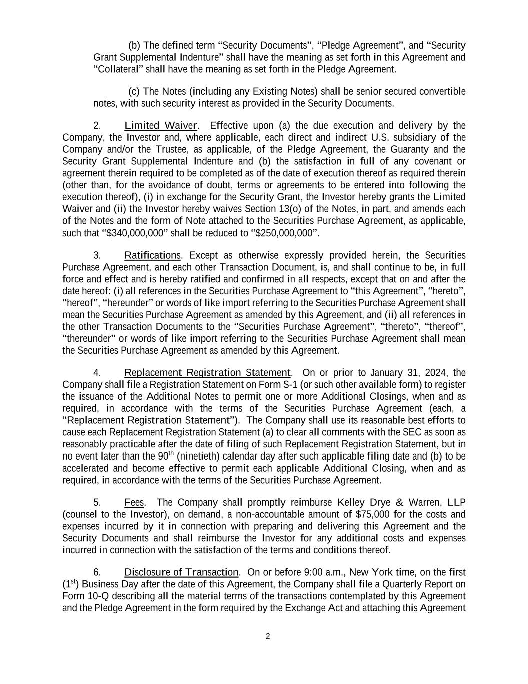2 (b) The defined term “Security Documents”, “Pledge Agreement”, and “Security Grant Supplemental Indenture” shall have the meaning as set forth in this Agreement and “Collateral” shall have the meaning as set forth in the Pledge Agreement. (c) The Notes (including any Existing Notes) shall be senior secured convertible notes, with such security interest as provided in the Security Documents. 2. Limited Waiver. Effective upon (a) the due execution and delivery by the Company, the Investor and, where applicable, each direct and indirect U.S. subsidiary of the Company and/or the Trustee, as applicable, of the Pledge Agreement, the Guaranty and the Security Grant Supplemental Indenture and (b) the satisfaction in full of any covenant or agreement therein required to be completed as of the date of execution thereof as required therein (other than, for the avoidance of doubt, terms or agreements to be entered into following the execution thereof), (i) in exchange for the Security Grant, the Investor hereby grants the Limited Waiver and (ii) the Investor hereby waives Section 13(o) of the Notes, in part, and amends each of the Notes and the form of Note attached to the Securities Purchase Agreement, as applicable, such that “$340,000,000” shall be reduced to “$250,000,000”. 3. Ratifications. Except as otherwise expressly provided herein, the Securities Purchase Agreement, and each other Transaction Document, is, and shall continue to be, in full force and effect and is hereby ratified and confirmed in all respects, except that on and after the date hereof: (i) all references in the Securities Purchase Agreement to “this Agreement”, “hereto”, “hereof”, “hereunder” or words of like import referring to the Securities Purchase Agreement shall mean the Securities Purchase Agreement as amended by this Agreement, and (ii) all references in the other Transaction Documents to the “Securities Purchase Agreement”, “thereto”, “thereof”, “thereunder” or words of like import referring to the Securities Purchase Agreement shall mean the Securities Purchase Agreement as amended by this Agreement. 4. Replacement Registration Statement. On or prior to January 31, 2024, the Company shall file a Registration Statement on Form S-1 (or such other available form) to register the issuance of the Additional Notes to permit one or more Additional Closings, when and as required, in accordance with the terms of the Securities Purchase Agreement (each, a “Replacement Registration Statement”). The Company shall use its reasonable best efforts to cause each Replacement Registration Statement (a) to clear all comments with the SEC as soon as reasonably practicable after the date of filing of such Replacement Registration Statement, but in no event later than the 90th (ninetieth) calendar day after such applicable filing date and (b) to be accelerated and become effective to permit each applicable Additional Closing, when and as required, in accordance with the terms of the Securities Purchase Agreement. 5. Fees. The Company shall promptly reimburse Kelley Drye & Warren, LLP (counsel to the Investor), on demand, a non-accountable amount of $75,000 for the costs and expenses incurred by it in connection with preparing and delivering this Agreement and the Security Documents and shall reimburse the Investor for any additional costs and expenses incurred in connection with the satisfaction of the terms and conditions thereof. 6. Disclosure of Transaction. On or before 9:00 a.m., New York time, on the first (1st) Business Day after the date of this Agreement, the Company shall file a Quarterly Report on Form 10-Q describing all the material terms of the transactions contemplated by this Agreement and the Pledge Agreement in the form required by the Exchange Act and attaching this Agreement