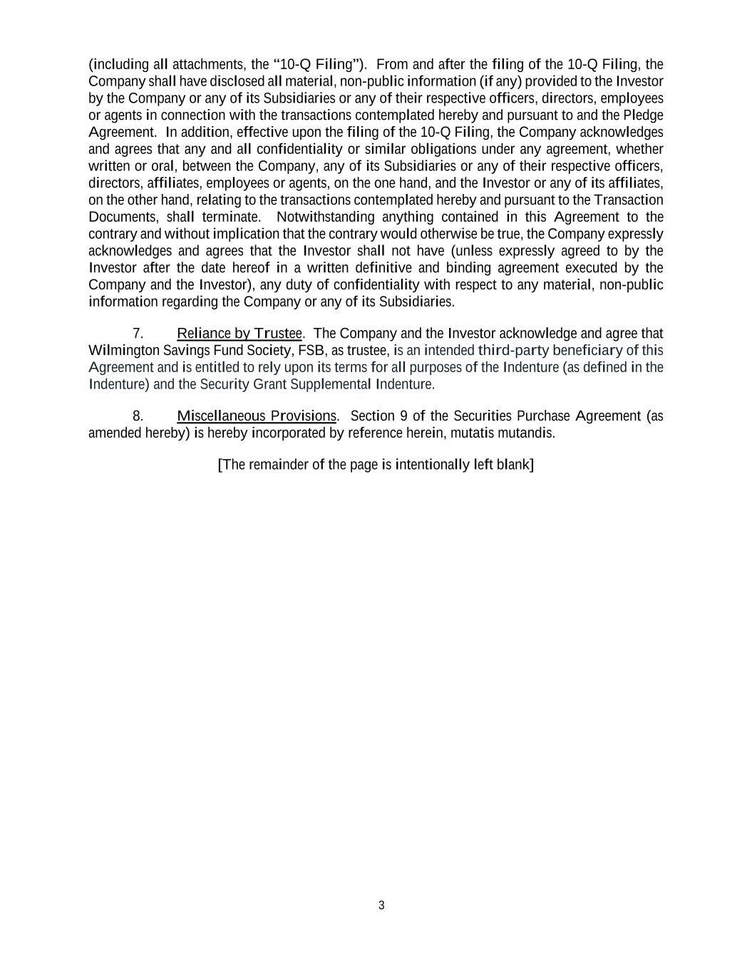 3 (including all attachments, the “10-Q Filing”). From and after the filing of the 10-Q Filing, the Company shall have disclosed all material, non-public information (if any) provided to the Investor by the Company or any of its Subsidiaries or any of their respective officers, directors, employees or agents in connection with the transactions contemplated hereby and pursuant to and the Pledge Agreement. In addition, effective upon the filing of the 10-Q Filing, the Company acknowledges and agrees that any and all confidentiality or similar obligations under any agreement, whether written or oral, between the Company, any of its Subsidiaries or any of their respective officers, directors, affiliates, employees or agents, on the one hand, and the Investor or any of its affiliates, on the other hand, relating to the transactions contemplated hereby and pursuant to the Transaction Documents, shall terminate. Notwithstanding anything contained in this Agreement to the contrary and without implication that the contrary would otherwise be true, the Company expressly acknowledges and agrees that the Investor shall not have (unless expressly agreed to by the Investor after the date hereof in a written definitive and binding agreement executed by the Company and the Investor), any duty of confidentiality with respect to any material, non-public information regarding the Company or any of its Subsidiaries. 7. Reliance by Trustee. The Company and the Investor acknowledge and agree that Wilmington Savings Fund Society, FSB, as trustee, is an intended third-party beneficiary of this Agreement and is entitled to rely upon its terms for all purposes of the Indenture (as defined in the Indenture) and the Security Grant Supplemental Indenture. 8. Miscellaneous Provisions. Section 9 of the Securities Purchase Agreement (as amended hereby) is hereby incorporated by reference herein, mutatis mutandis. [The remainder of the page is intentionally left blank]