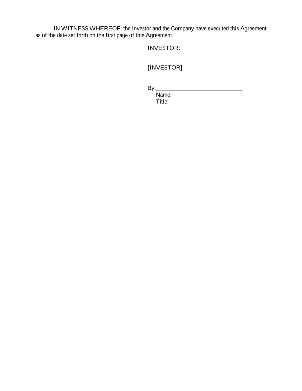 IN WITNESS WHEREOF, the Investor and the Company have executed this Agreement as of the date set forth on the first page of this Agreement. INVESTOR: [INVESTOR] By: Name: Title:
