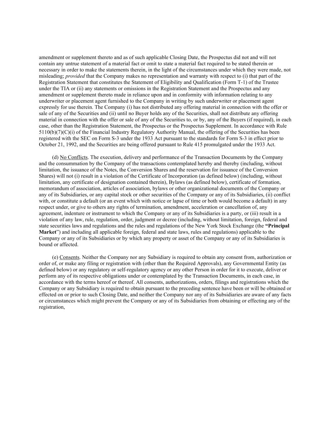 amendment or supplement thereto and as of such applicable Closing Date, the Prospectus did not and will not contain any untrue statement of a material fact or omit to state a material fact required to be stated therein or necessary in order to make the statements therein, in the light of the circumstances under which they were made, not misleading; provided that the Company makes no representation and warranty with respect to (i) that part of the Registration Statement that constitutes the Statement of Eligibility and Qualification (Form T-1) of the Trustee under the TIA or (ii) any statements or omissions in the Registration Statement and the Prospectus and any amendment or supplement thereto made in reliance upon and in conformity with information relating to any underwriter or placement agent furnished to the Company in writing by such underwriter or placement agent expressly for use therein. The Company (i) has not distributed any offering material in connection with the offer or sale of any of the Securities and (ii) until no Buyer holds any of the Securities, shall not distribute any offering material in connection with the offer or sale of any of the Securities to, or by, any of the Buyers (if required), in each case, other than the Registration Statement, the Prospectus or the Prospectus Supplement. In accordance with Rule 5110(b)(7)(C)(i) of the Financial Industry Regulatory Authority Manual, the offering of the Securities has been registered with the SEC on Form S-3 under the 1933 Act pursuant to the standards for Form S-3 in effect prior to October 21, 1992, and the Securities are being offered pursuant to Rule 415 promulgated under the 1933 Act. (d) No Conflicts. The execution, delivery and performance of the Transaction Documents by the Company and the consummation by the Company of the transactions contemplated hereby and thereby (including, without limitation, the issuance of the Notes, the Conversion Shares and the reservation for issuance of the Conversion Shares) will not (i) result in a violation of the Certificate of Incorporation (as defined below) (including, without limitation, any certificate of designation contained therein), Bylaws (as defined below), certificate of formation, memorandum of association, articles of association, bylaws or other organizational documents of the Company or any of its Subsidiaries, or any capital stock or other securities of the Company or any of its Subsidiaries, (ii) conflict with, or constitute a default (or an event which with notice or lapse of time or both would become a default) in any respect under, or give to others any rights of termination, amendment, acceleration or cancellation of, any agreement, indenture or instrument to which the Company or any of its Subsidiaries is a party, or (iii) result in a violation of any law, rule, regulation, order, judgment or decree (including, without limitation, foreign, federal and state securities laws and regulations and the rules and regulations of the New York Stock Exchange (the “Principal Market”) and including all applicable foreign, federal and state laws, rules and regulations) applicable to the Company or any of its Subsidiaries or by which any property or asset of the Company or any of its Subsidiaries is bound or affected. (e) Consents. Neither the Company nor any Subsidiary is required to obtain any consent from, authorization or order of, or make any filing or registration with (other than the Required Approvals), any Governmental Entity (as defined below) or any regulatory or self-regulatory agency or any other Person in order for it to execute, deliver or perform any of its respective obligations under or contemplated by the Transaction Documents, in each case, in accordance with the terms hereof or thereof. All consents, authorizations, orders, filings and registrations which the Company or any Subsidiary is required to obtain pursuant to the preceding sentence have been or will be obtained or effected on or prior to such Closing Date, and neither the Company nor any of its Subsidiaries are aware of any facts or circumstances which might prevent the Company or any of its Subsidiaries from obtaining or effecting any of the registration,