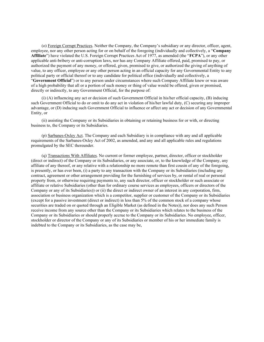 (o) Foreign Corrupt Practices. Neither the Company, the Company’s subsidiary or any director, officer, agent, employee, nor any other person acting for or on behalf of the foregoing (individually and collectively, a “Company Affiliate”) have violated the U.S. Foreign Corrupt Practices Act of 1977, as amended (the “FCPA”), or any other applicable anti-bribery or anti-corruption laws, nor has any Company Affiliate offered, paid, promised to pay, or authorized the payment of any money, or offered, given, promised to give, or authorized the giving of anything of value, to any officer, employee or any other person acting in an official capacity for any Governmental Entity to any political party or official thereof or to any candidate for political office (individually and collectively, a “Government Official”) or to any person under circumstances where such Company Affiliate knew or was aware of a high probability that all or a portion of such money or thing of value would be offered, given or promised, directly or indirectly, to any Government Official, for the purpose of: (i) (A) influencing any act or decision of such Government Official in his/her official capacity, (B) inducing such Government Official to do or omit to do any act in violation of his/her lawful duty, (C) securing any improper advantage, or (D) inducing such Government Official to influence or affect any act or decision of any Governmental Entity, or (ii) assisting the Company or its Subsidiaries in obtaining or retaining business for or with, or directing business to, the Company or its Subsidiaries. (p) Sarbanes-Oxley Act. The Company and each Subsidiary is in compliance with any and all applicable requirements of the Sarbanes-Oxley Act of 2002, as amended, and any and all applicable rules and regulations promulgated by the SEC thereunder. (q) Transactions With Affiliates. No current or former employee, partner, director, officer or stockholder (direct or indirect) of the Company or its Subsidiaries, or any associate, or, to the knowledge of the Company, any affiliate of any thereof, or any relative with a relationship no more remote than first cousin of any of the foregoing, is presently, or has ever been, (i) a party to any transaction with the Company or its Subsidiaries (including any contract, agreement or other arrangement providing for the furnishing of services by, or rental of real or personal property from, or otherwise requiring payments to, any such director, officer or stockholder or such associate or affiliate or relative Subsidiaries (other than for ordinary course services as employees, officers or directors of the Company or any of its Subsidiaries)) or (ii) the direct or indirect owner of an interest in any corporation, firm, association or business organization which is a competitor, supplier or customer of the Company or its Subsidiaries (except for a passive investment (direct or indirect) in less than 5% of the common stock of a company whose securities are traded on or quoted through an Eligible Market (as defined in the Notes)), nor does any such Person receive income from any source other than the Company or its Subsidiaries which relates to the business of the Company or its Subsidiaries or should properly accrue to the Company or its Subsidiaries. No employee, officer, stockholder or director of the Company or any of its Subsidiaries or member of his or her immediate family is indebted to the Company or its Subsidiaries, as the case may be,