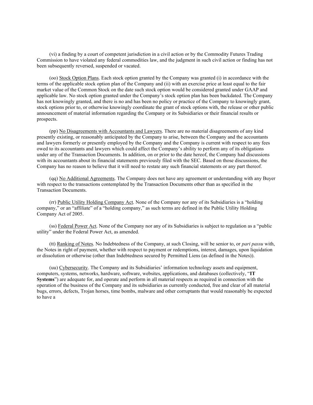 (vi) a finding by a court of competent jurisdiction in a civil action or by the Commodity Futures Trading Commission to have violated any federal commodities law, and the judgment in such civil action or finding has not been subsequently reversed, suspended or vacated. (oo) Stock Option Plans. Each stock option granted by the Company was granted (i) in accordance with the terms of the applicable stock option plan of the Company and (ii) with an exercise price at least equal to the fair market value of the Common Stock on the date such stock option would be considered granted under GAAP and applicable law. No stock option granted under the Company’s stock option plan has been backdated. The Company has not knowingly granted, and there is no and has been no policy or practice of the Company to knowingly grant, stock options prior to, or otherwise knowingly coordinate the grant of stock options with, the release or other public announcement of material information regarding the Company or its Subsidiaries or their financial results or prospects. (pp) No Disagreements with Accountants and Lawyers. There are no material disagreements of any kind presently existing, or reasonably anticipated by the Company to arise, between the Company and the accountants and lawyers formerly or presently employed by the Company and the Company is current with respect to any fees owed to its accountants and lawyers which could affect the Company’s ability to perform any of its obligations under any of the Transaction Documents. In addition, on or prior to the date hereof, the Company had discussions with its accountants about its financial statements previously filed with the SEC. Based on those discussions, the Company has no reason to believe that it will need to restate any such financial statements or any part thereof. (qq) No Additional Agreements. The Company does not have any agreement or understanding with any Buyer with respect to the transactions contemplated by the Transaction Documents other than as specified in the Transaction Documents. (rr) Public Utility Holding Company Act. None of the Company nor any of its Subsidiaries is a “holding company,” or an “affiliate” of a “holding company,” as such terms are defined in the Public Utility Holding Company Act of 2005. (ss) Federal Power Act. None of the Company nor any of its Subsidiaries is subject to regulation as a “public utility” under the Federal Power Act, as amended. (tt) Ranking of Notes. No Indebtedness of the Company, at such Closing, will be senior to, or pari passu with, the Notes in right of payment, whether with respect to payment or redemptions, interest, damages, upon liquidation or dissolution or otherwise (other than Indebtedness secured by Permitted Liens (as defined in the Notes)). (uu) Cybersecurity. The Company and its Subsidiaries’ information technology assets and equipment, computers, systems, networks, hardware, software, websites, applications, and databases (collectively, “IT Systems”) are adequate for, and operate and perform in all material respects as required in connection with the operation of the business of the Company and its subsidiaries as currently conducted, free and clear of all material bugs, errors, defects, Trojan horses, time bombs, malware and other corruptants that would reasonably be expected to have a