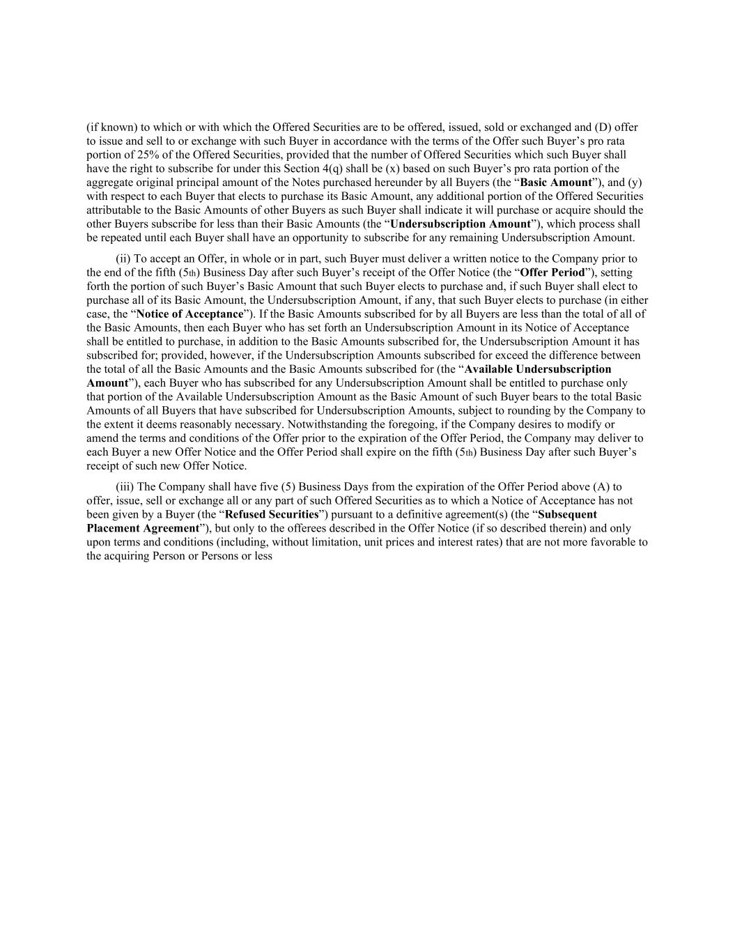 (if known) to which or with which the Offered Securities are to be offered, issued, sold or exchanged and (D) offer to issue and sell to or exchange with such Buyer in accordance with the terms of the Offer such Buyer’s pro rata portion of 25% of the Offered Securities, provided that the number of Offered Securities which such Buyer shall have the right to subscribe for under this Section 4(q) shall be (x) based on such Buyer’s pro rata portion of the aggregate original principal amount of the Notes purchased hereunder by all Buyers (the “Basic Amount”), and (y) with respect to each Buyer that elects to purchase its Basic Amount, any additional portion of the Offered Securities attributable to the Basic Amounts of other Buyers as such Buyer shall indicate it will purchase or acquire should the other Buyers subscribe for less than their Basic Amounts (the “Undersubscription Amount”), which process shall be repeated until each Buyer shall have an opportunity to subscribe for any remaining Undersubscription Amount. (ii) To accept an Offer, in whole or in part, such Buyer must deliver a written notice to the Company prior to the end of the fifth (5th) Business Day after such Buyer’s receipt of the Offer Notice (the “Offer Period”), setting forth the portion of such Buyer’s Basic Amount that such Buyer elects to purchase and, if such Buyer shall elect to purchase all of its Basic Amount, the Undersubscription Amount, if any, that such Buyer elects to purchase (in either case, the “Notice of Acceptance”). If the Basic Amounts subscribed for by all Buyers are less than the total of all of the Basic Amounts, then each Buyer who has set forth an Undersubscription Amount in its Notice of Acceptance shall be entitled to purchase, in addition to the Basic Amounts subscribed for, the Undersubscription Amount it has subscribed for; provided, however, if the Undersubscription Amounts subscribed for exceed the difference between the total of all the Basic Amounts and the Basic Amounts subscribed for (the “Available Undersubscription Amount”), each Buyer who has subscribed for any Undersubscription Amount shall be entitled to purchase only that portion of the Available Undersubscription Amount as the Basic Amount of such Buyer bears to the total Basic Amounts of all Buyers that have subscribed for Undersubscription Amounts, subject to rounding by the Company to the extent it deems reasonably necessary. Notwithstanding the foregoing, if the Company desires to modify or amend the terms and conditions of the Offer prior to the expiration of the Offer Period, the Company may deliver to each Buyer a new Offer Notice and the Offer Period shall expire on the fifth (5th) Business Day after such Buyer’s receipt of such new Offer Notice. (iii) The Company shall have five (5) Business Days from the expiration of the Offer Period above (A) to offer, issue, sell or exchange all or any part of such Offered Securities as to which a Notice of Acceptance has not been given by a Buyer (the “Refused Securities”) pursuant to a definitive agreement(s) (the “Subsequent Placement Agreement”), but only to the offerees described in the Offer Notice (if so described therein) and only upon terms and conditions (including, without limitation, unit prices and interest rates) that are not more favorable to the acquiring Person or Persons or less