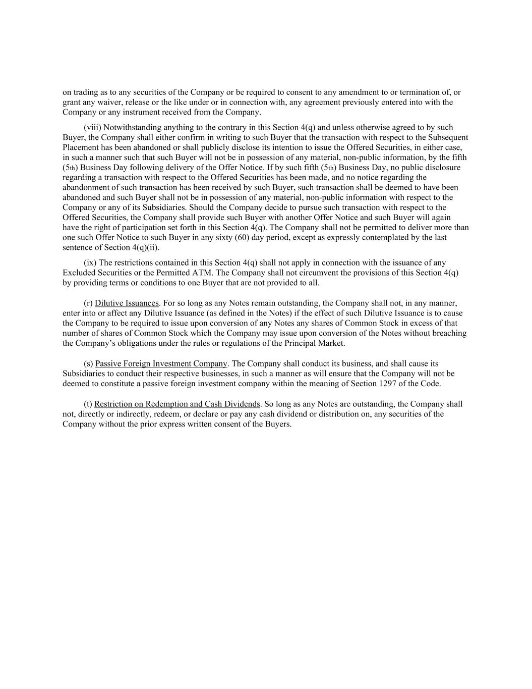 on trading as to any securities of the Company or be required to consent to any amendment to or termination of, or grant any waiver, release or the like under or in connection with, any agreement previously entered into with the Company or any instrument received from the Company. (viii) Notwithstanding anything to the contrary in this Section 4(q) and unless otherwise agreed to by such Buyer, the Company shall either confirm in writing to such Buyer that the transaction with respect to the Subsequent Placement has been abandoned or shall publicly disclose its intention to issue the Offered Securities, in either case, in such a manner such that such Buyer will not be in possession of any material, non-public information, by the fifth (5th) Business Day following delivery of the Offer Notice. If by such fifth (5th) Business Day, no public disclosure regarding a transaction with respect to the Offered Securities has been made, and no notice regarding the abandonment of such transaction has been received by such Buyer, such transaction shall be deemed to have been abandoned and such Buyer shall not be in possession of any material, non-public information with respect to the Company or any of its Subsidiaries. Should the Company decide to pursue such transaction with respect to the Offered Securities, the Company shall provide such Buyer with another Offer Notice and such Buyer will again have the right of participation set forth in this Section 4(q). The Company shall not be permitted to deliver more than one such Offer Notice to such Buyer in any sixty (60) day period, except as expressly contemplated by the last sentence of Section 4(q)(ii). (ix) The restrictions contained in this Section 4(q) shall not apply in connection with the issuance of any Excluded Securities or the Permitted ATM. The Company shall not circumvent the provisions of this Section 4(q) by providing terms or conditions to one Buyer that are not provided to all. (r) Dilutive Issuances. For so long as any Notes remain outstanding, the Company shall not, in any manner, enter into or affect any Dilutive Issuance (as defined in the Notes) if the effect of such Dilutive Issuance is to cause the Company to be required to issue upon conversion of any Notes any shares of Common Stock in excess of that number of shares of Common Stock which the Company may issue upon conversion of the Notes without breaching the Company’s obligations under the rules or regulations of the Principal Market. (s) Passive Foreign Investment Company. The Company shall conduct its business, and shall cause its Subsidiaries to conduct their respective businesses, in such a manner as will ensure that the Company will not be deemed to constitute a passive foreign investment company within the meaning of Section 1297 of the Code. (t) Restriction on Redemption and Cash Dividends. So long as any Notes are outstanding, the Company shall not, directly or indirectly, redeem, or declare or pay any cash dividend or distribution on, any securities of the Company without the prior express written consent of the Buyers.